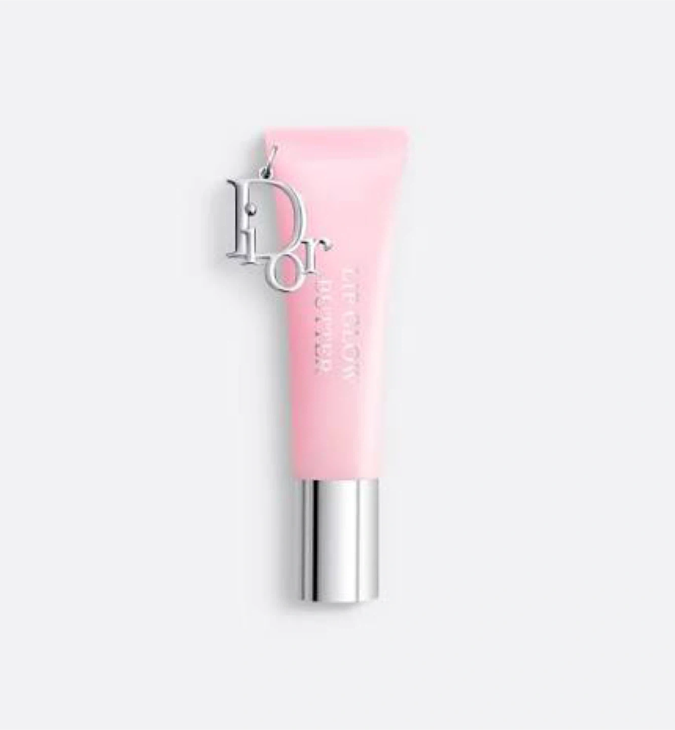 This is a Dior Lip Glow Butter. It's a conditioning lip balm. The packaging is a pink tube with a silver cap and a Dior charm.