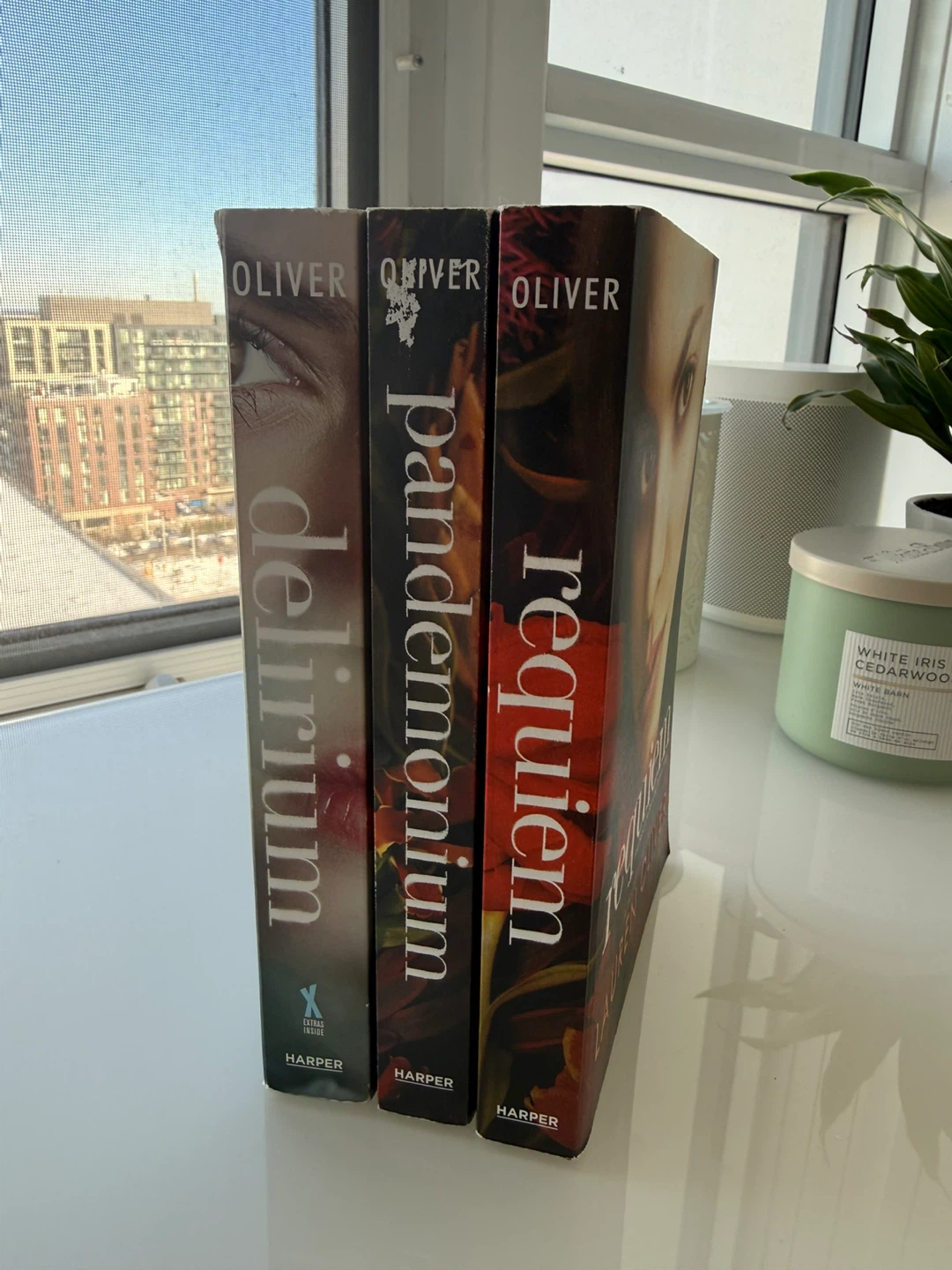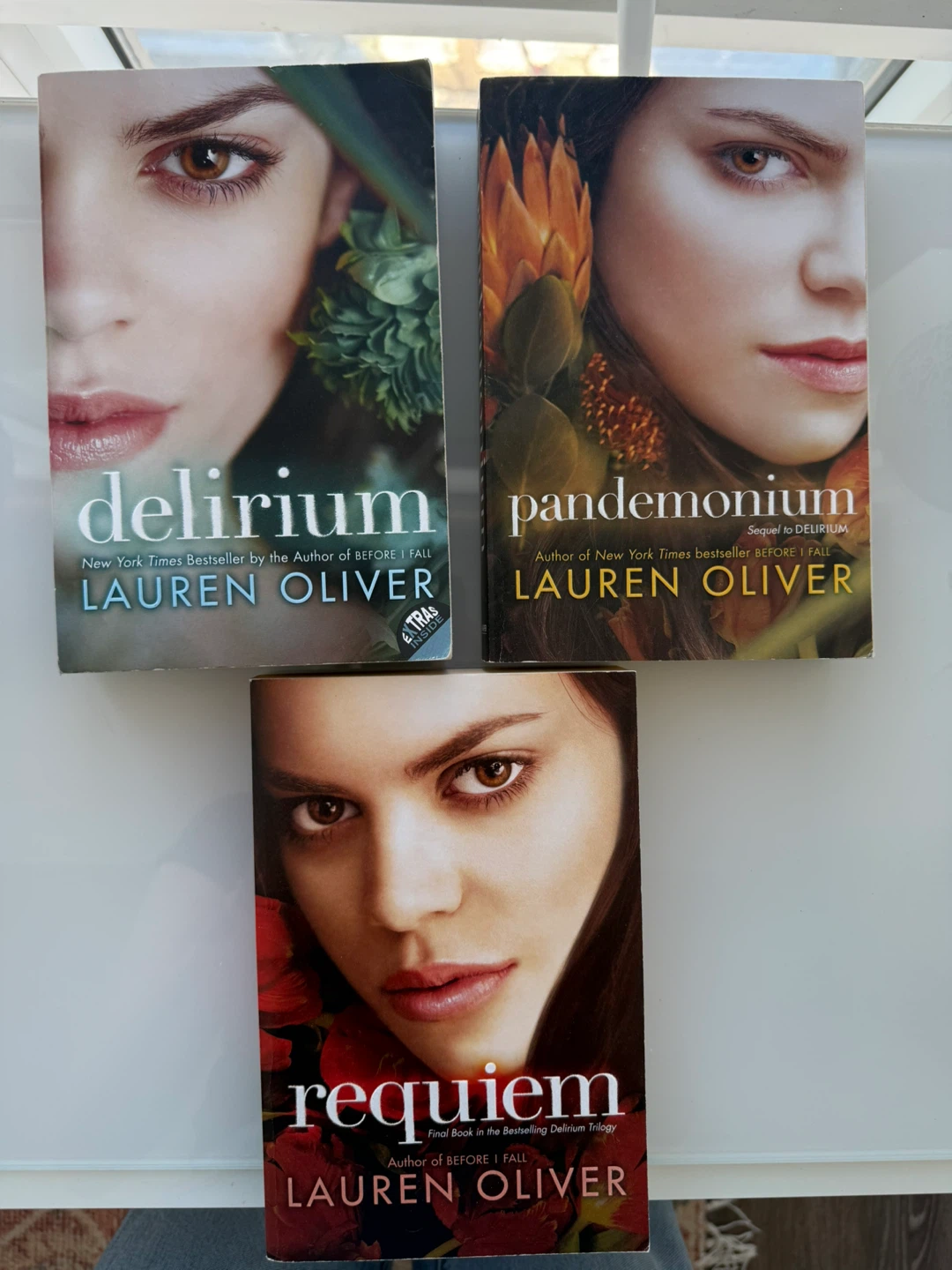 This is a set of three books: Delirium, Pandemonium, and Requiem. They're part of a New York Times bestselling series by Lauren Oliver. These paperbacks are from HarperCollins Publishers.