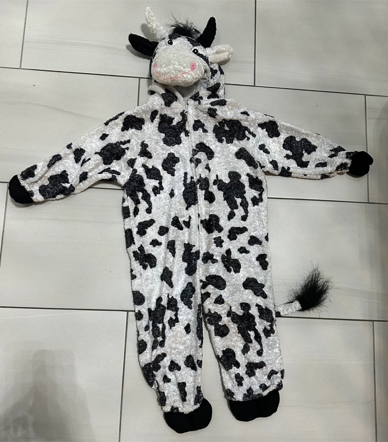 106Adorable cow costume onesie! Perfect for dress-up or Halloween. Features a hood with a cute cow face and a tail. In great new condition and ready for a new home! It says One Size Only but I’d say it fits around a 5 year old. You’re welcome to try on before purchasing.