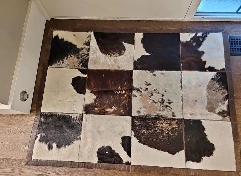 15Designer Cow hide mat from squares. Some wear on a few squares.