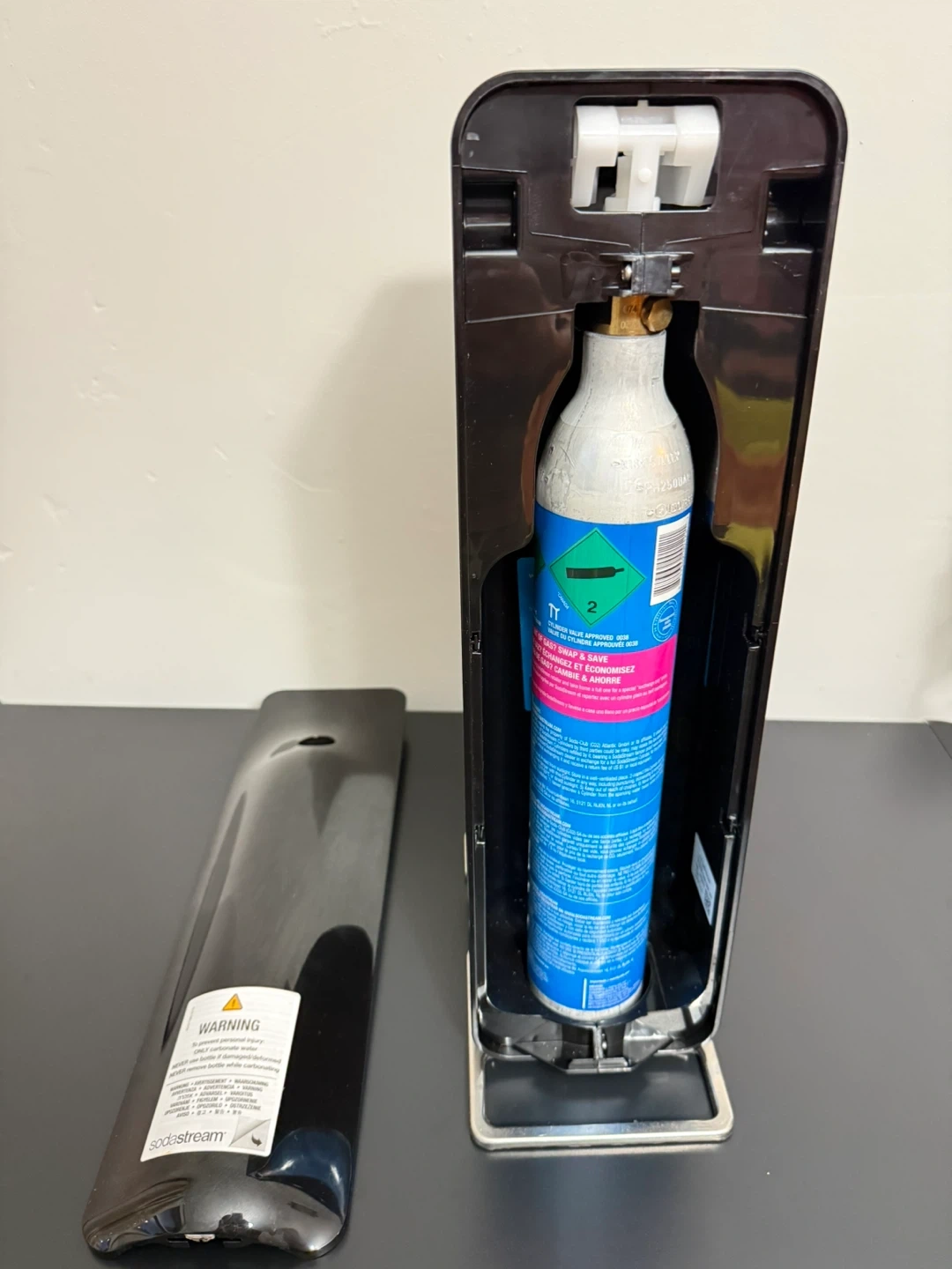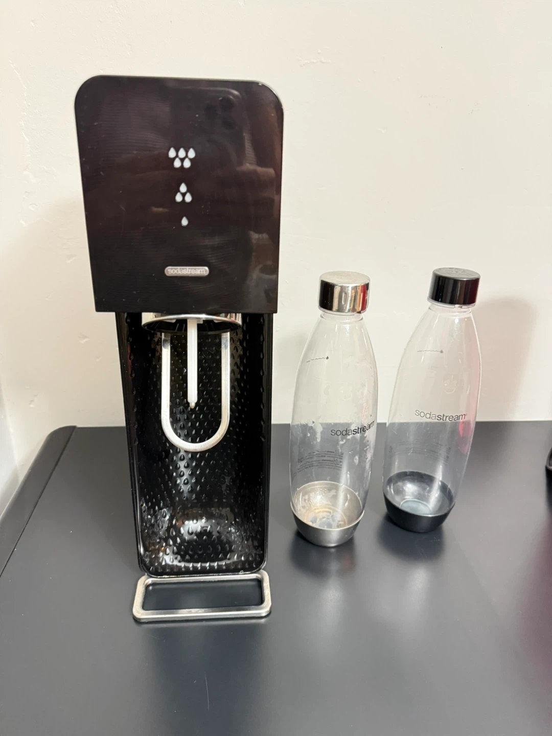 Make fresh sparkling water at home with this black SodaStream maker. It comes with two reusable bottles and a CO2 cylinder. Easy to use and great for reducing plastic waste!