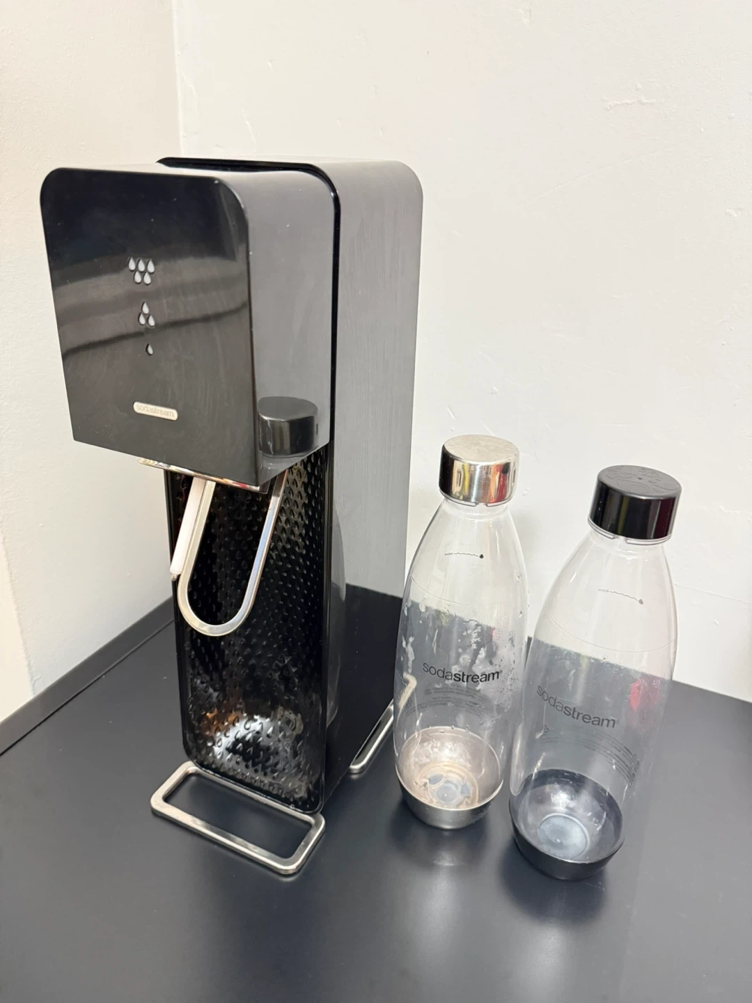 Make fresh sparkling water at home with this black SodaStream maker. It comes with two reusable bottles and a CO2 cylinder. Easy to use and great for reducing plastic waste!