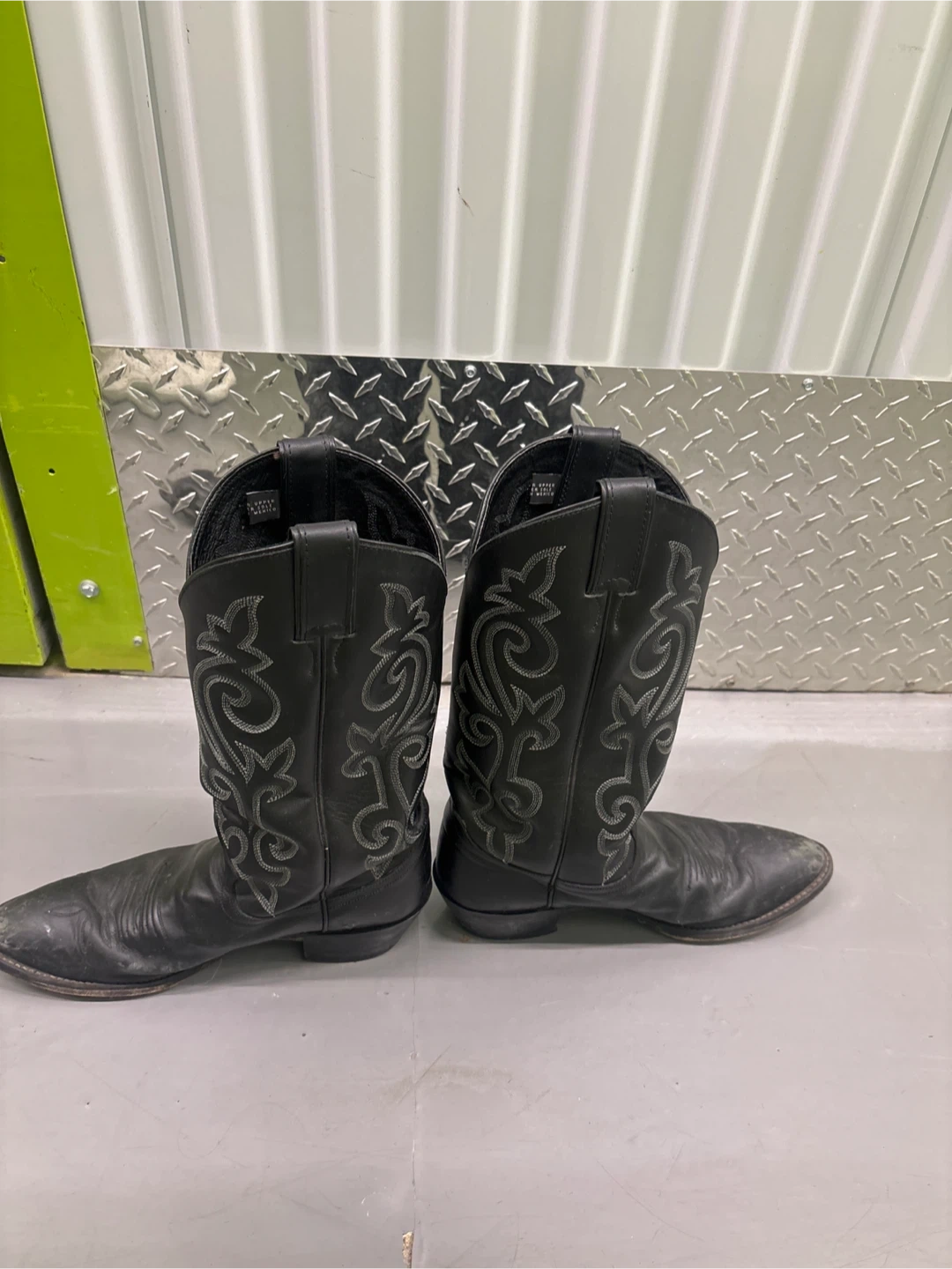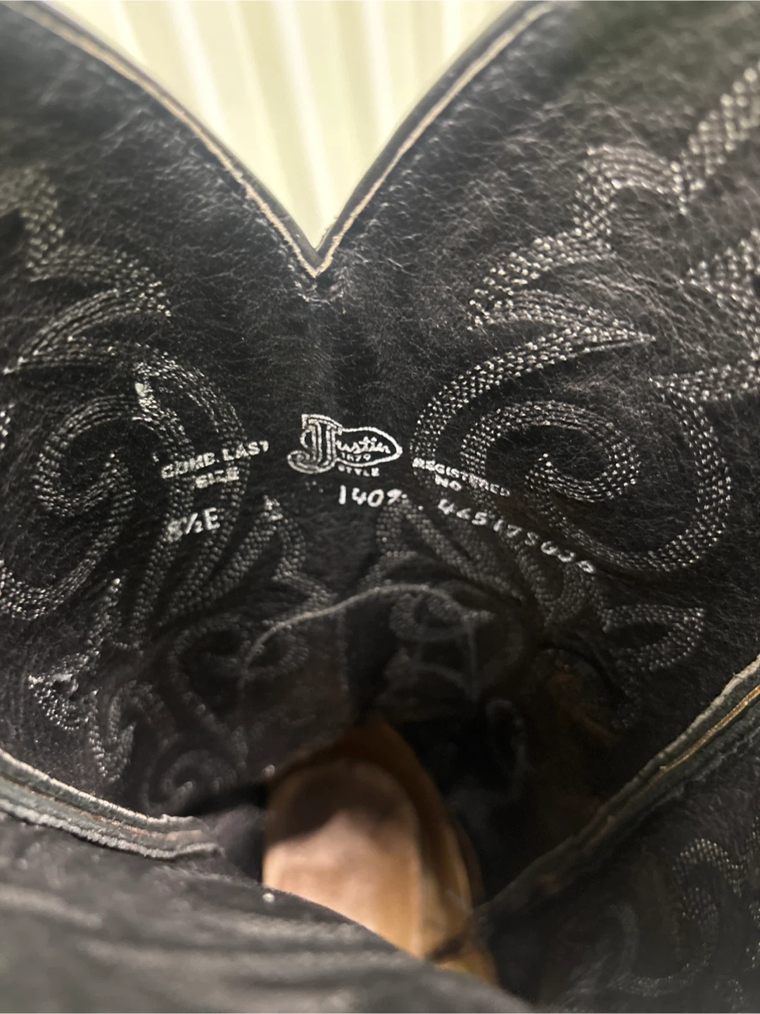 105Selling a pair of authentic Justin cowboy boots in black leather. They are a size 8.5E and the style number is 1402. These boots have some wear but are still in good condition for riding or everyday wear!