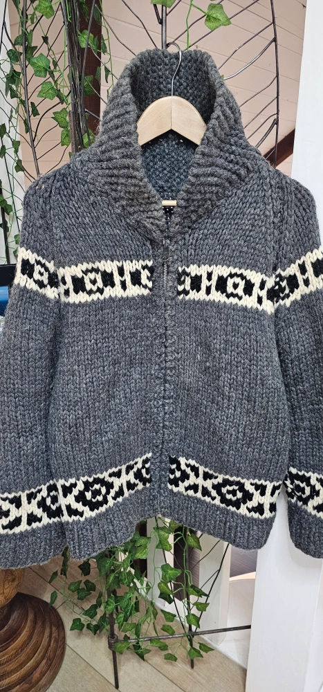 60Lightly used. Cozy up in this wool knit zip-up sweater! The grey and cream pattern adds a touch of warmth to any outfit. Perfect for layering on those chilly Canadian days, this sweater is sure to keep you snug and stylish