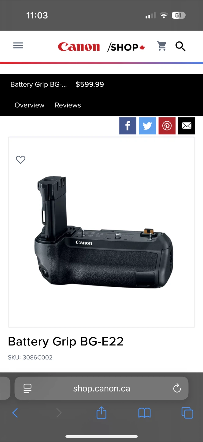 Selling a Canon Battery Grip BG-E22 in like new condition! It comes with the original box and all included components. This grip enhances your camera's battery life and provides a more comfortable grip for vertical shooting. Perfect for photographers looking to extend their shooting time!