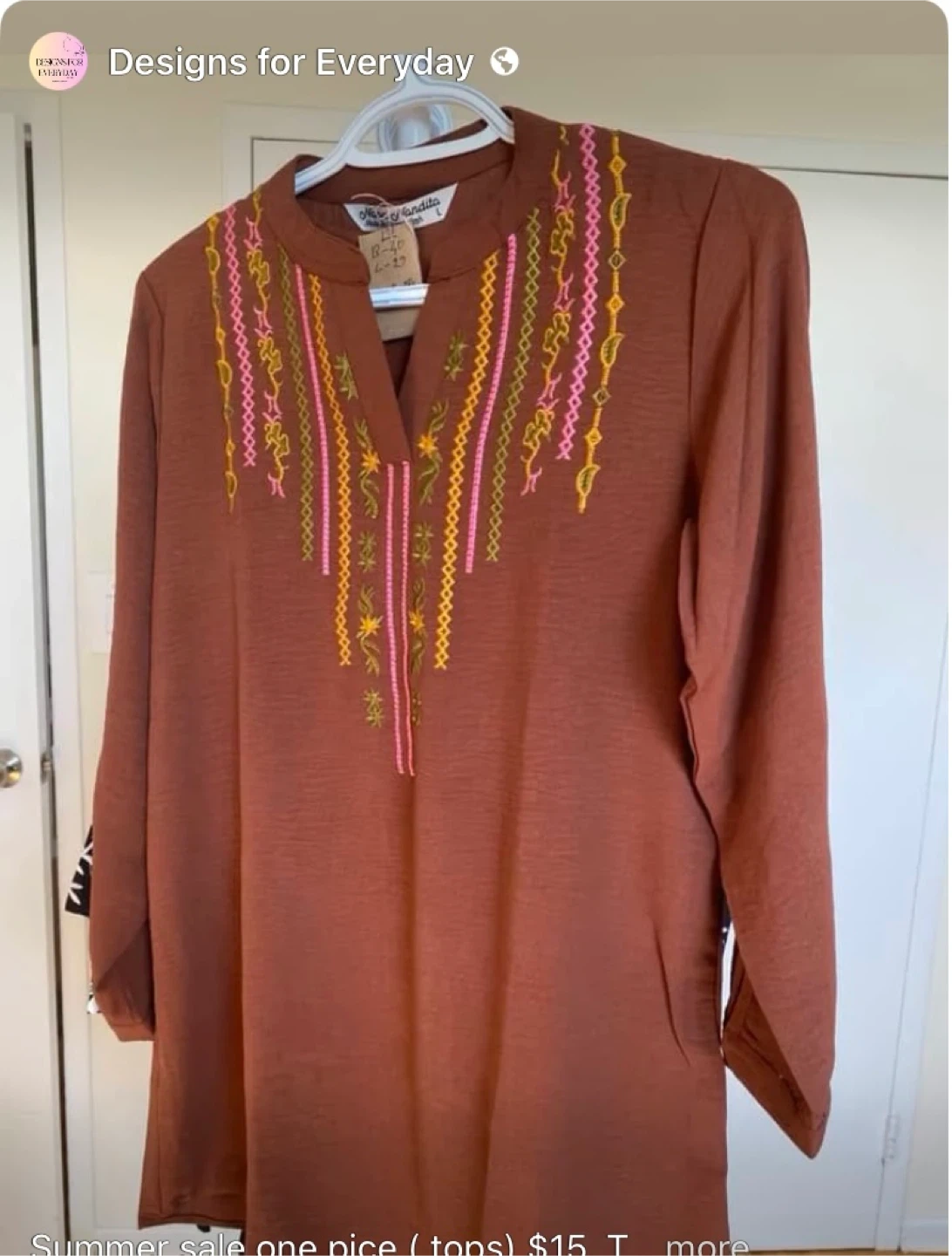 Selling a cute brown top from Designs for Everyday! It features lovely pink and yellow embroidery around the neckline. The size is L.