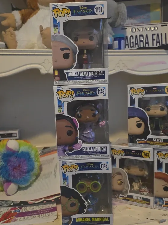 Three Funko Pop! vinyl figures from Disney's Encanto: Abuela Alma Madrigal (1151), Isabela Madrigal (1146), and Mirabel Madrigal (1145). These collectible figures come in their original boxes. Perfect for any Encanto fan's collection!