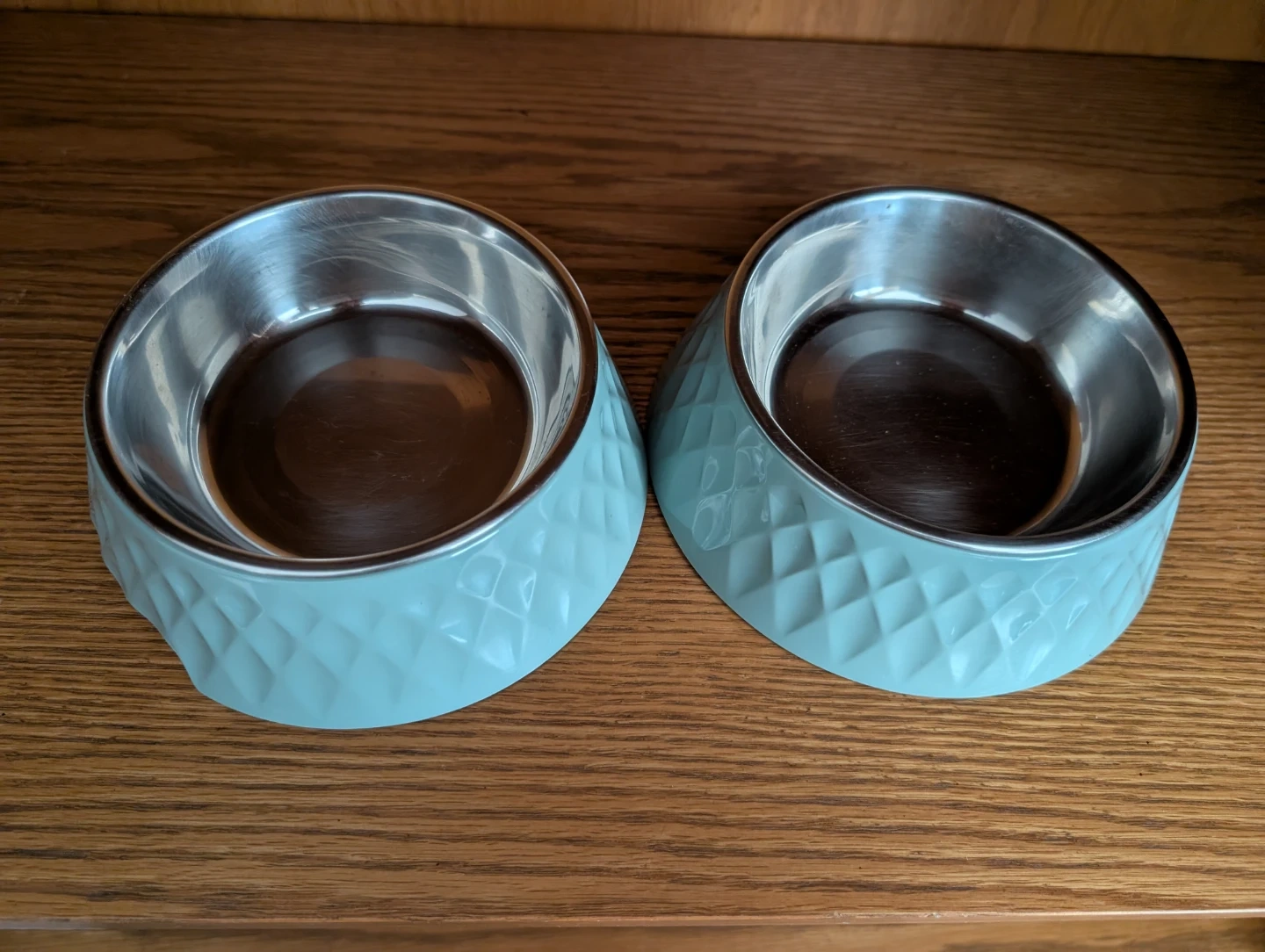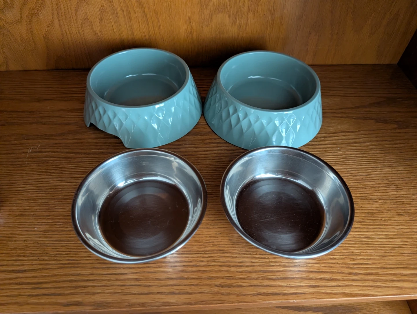 includes two pet bowls, one stainless steel insert and one light blue decorative outer bowl.