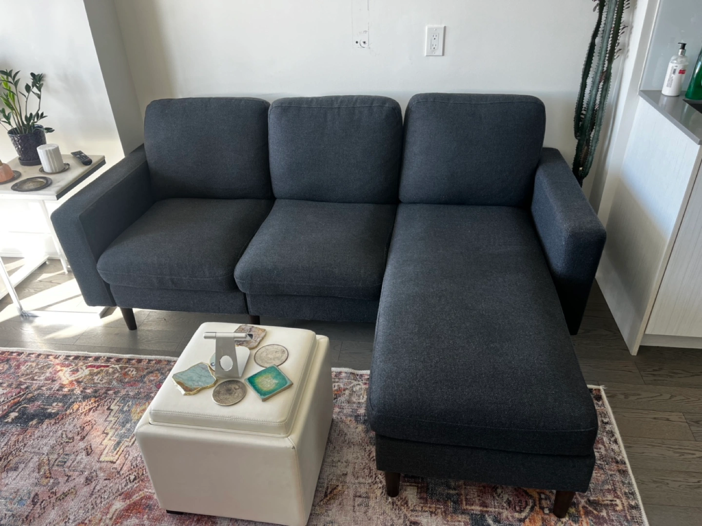 5Three-seater sectional sofa. Dark grey fabric upholstery. Wooden legs. Comfortable and stylish. Modular design, comes apart for easy transportation. Pet-free, smoke-free, bug-free, child-free home. Very clean. Selling because I bought a new one for a change of style. Cash only. I can help you carry it down and load it in your vehicle.