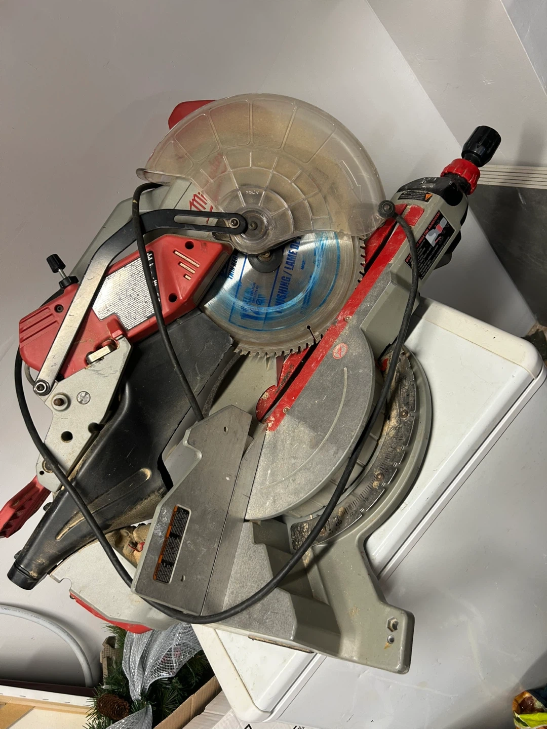 Milwaukee compound miter saw. This saw is suitable for various cutting tasks. It has a durable construction and is designed for precision.