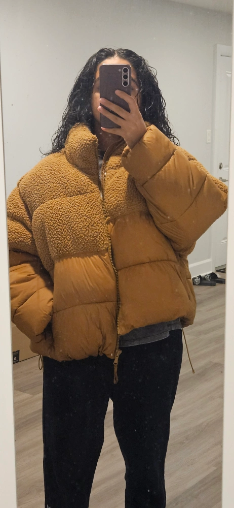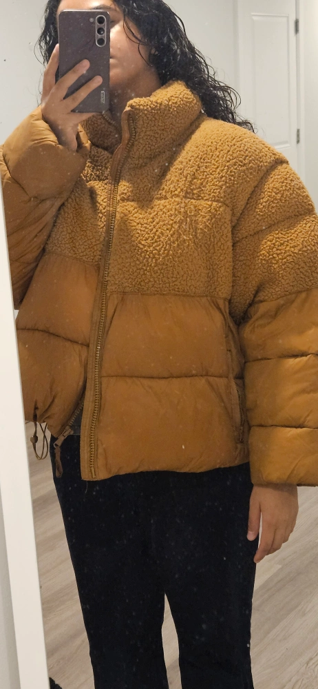 15Selling a gently used Cozy Puffer Jacket! It's a size medium and in great condition. The jacket features a unique design with a sherpa-like material on the upper portion and a classic puffer style on the lower part. Perfect for staying warm and stylish during the colder months!