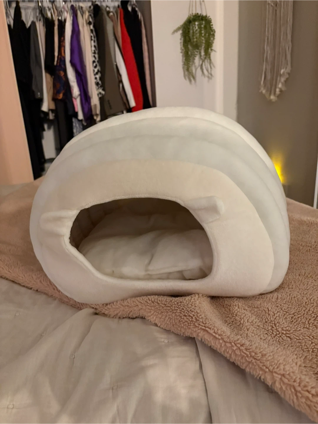 65Selling a gently used cat bed cave in white! It's in great condition and provides a comfy and secure space for your feline friend to relax and nap. It's made of soft material, perfect for a cozy retreat