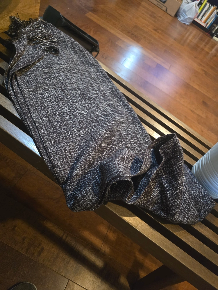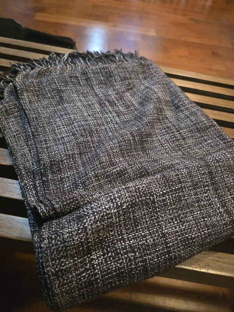 Selling a large scarf with a nice woven texture! It's grey . Perfect for cozying up on a chilly evening, it adds a touch of warmth and style .