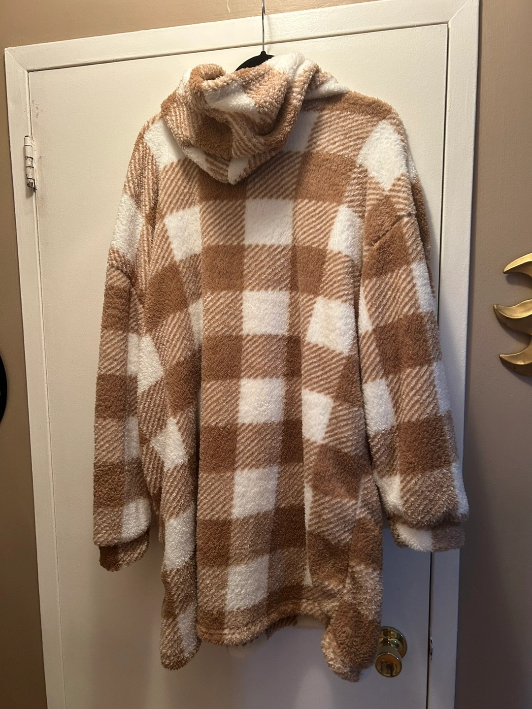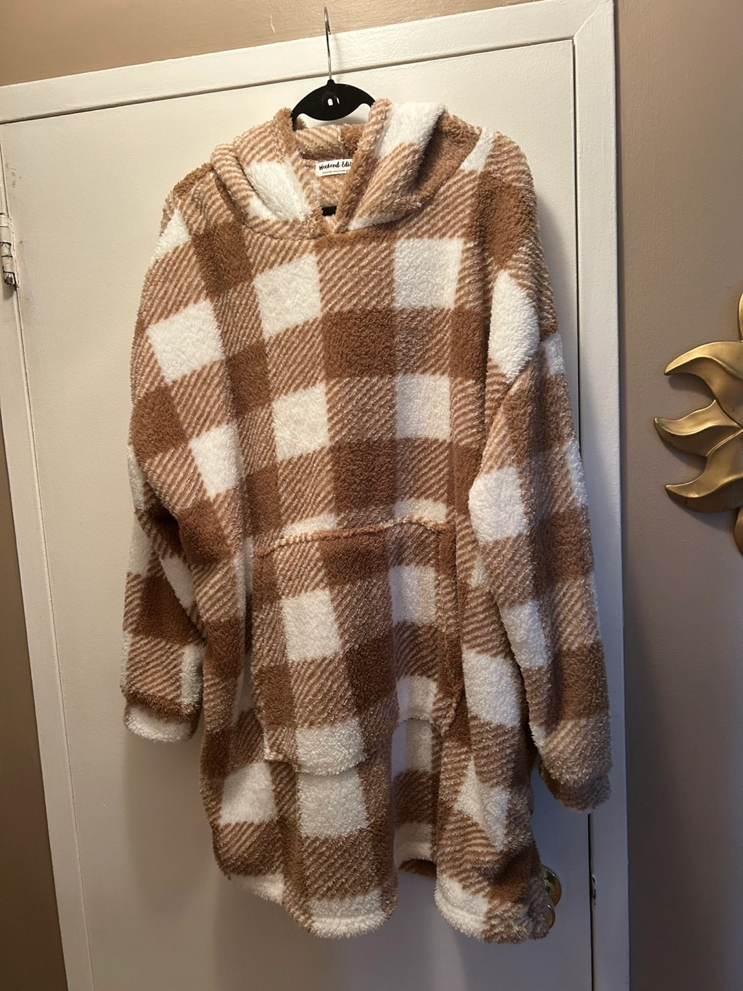 Cozy oversized sherpa hoodie blanket. Features a large hood and kangaroo pocket. Brown and white buffalo checkered pattern. Super soft and warm, perfect for lounging.