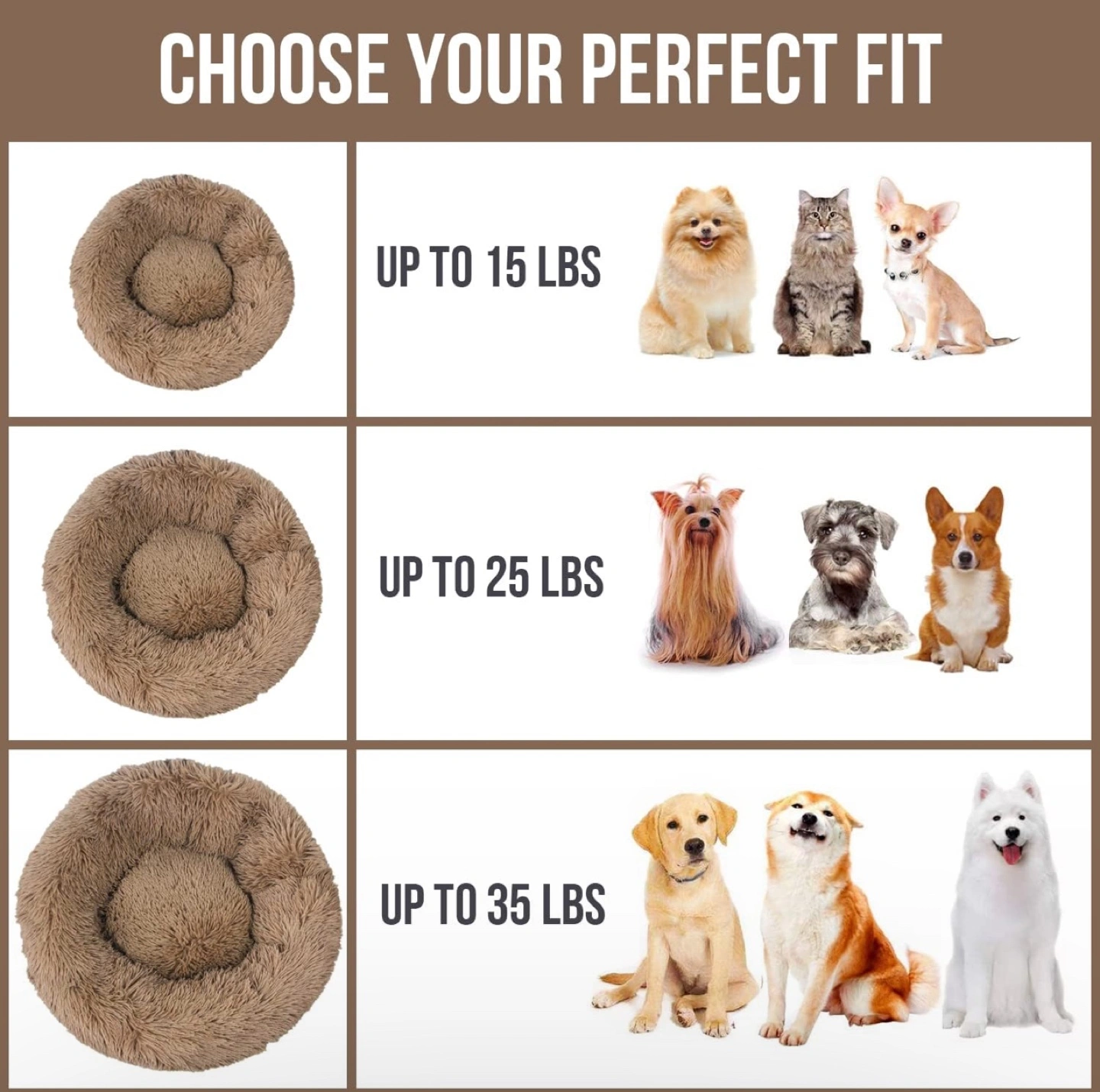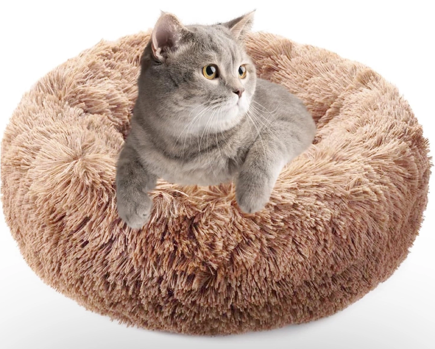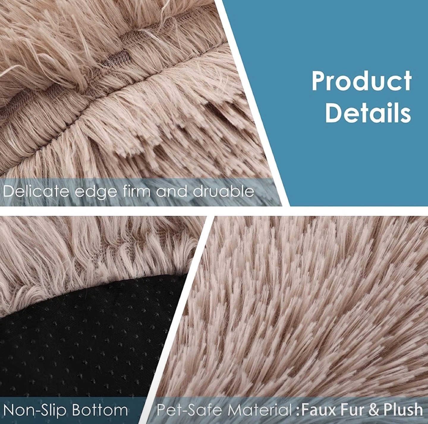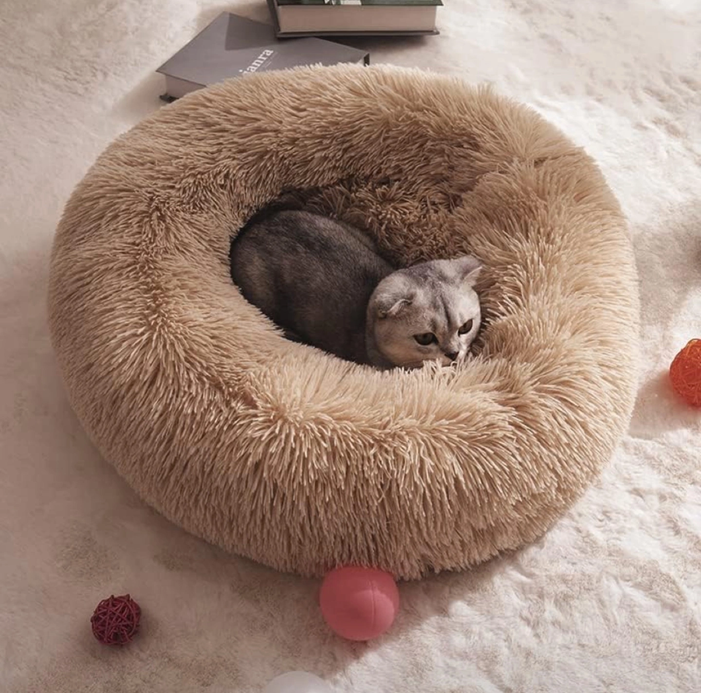 Soft, plush pet bed. Features a non-slip bottom. Durable and self-warming faux fur. Available in multiple sizes. Ideal for cats and small dogs. 【Design for Cozy Sleep】:Comfy soft warm Bionic faux fur dog bed is reminiscent of a pet mom’s embrace,creating an anti anxiety and calming pet bed, make your pet have deep restful sleep. 【Scientific Design Puppy Beds】:The raised edge of our pet bed gives your dog enough support to the head and a sense of security, there is also enough padding on the bottom and sides to relieve the dog's muscle soreness and joint pain. 【Easy to Clean】:Pet bed has been designed with a non-slip base, which can be easily fixed on the tile and hardwood floor of the home. It's versatile design can be seamlessly added to the decoration of any room. Hand wash or simply machine wash and dryer -- Machine wash, gentle cycle, Tumble dry, low heat. Please pat to make the dog bed completely fluffy before use. 【Size Choice】: 20"(50cm) bed for pets up to 15lbs. Donut cuddler dog bed suitable for large, medium and small dogs or cats. If your pet likes to chew, you can place a chew toy on our dog bed. 【Wide Range of Use】:The round cat beds features an anti slip bottom, which can prevent moving and shifting to ensure the safety of pets.Our pet bed works great not only on your home’s floor, but also on the seat of your car. It can be conveniently placed on the trunk or back seat as a travel bed for pets to rest and relax.