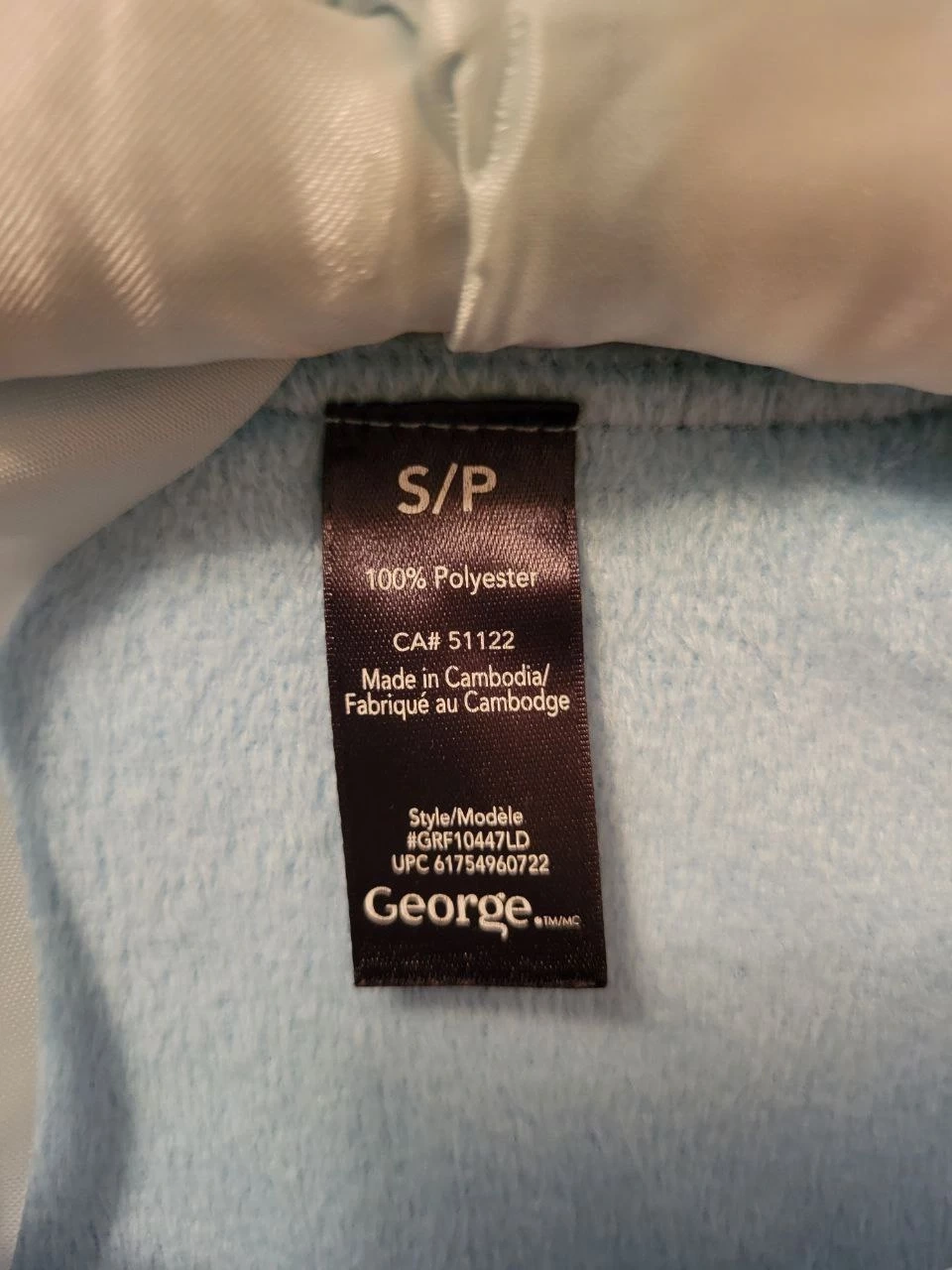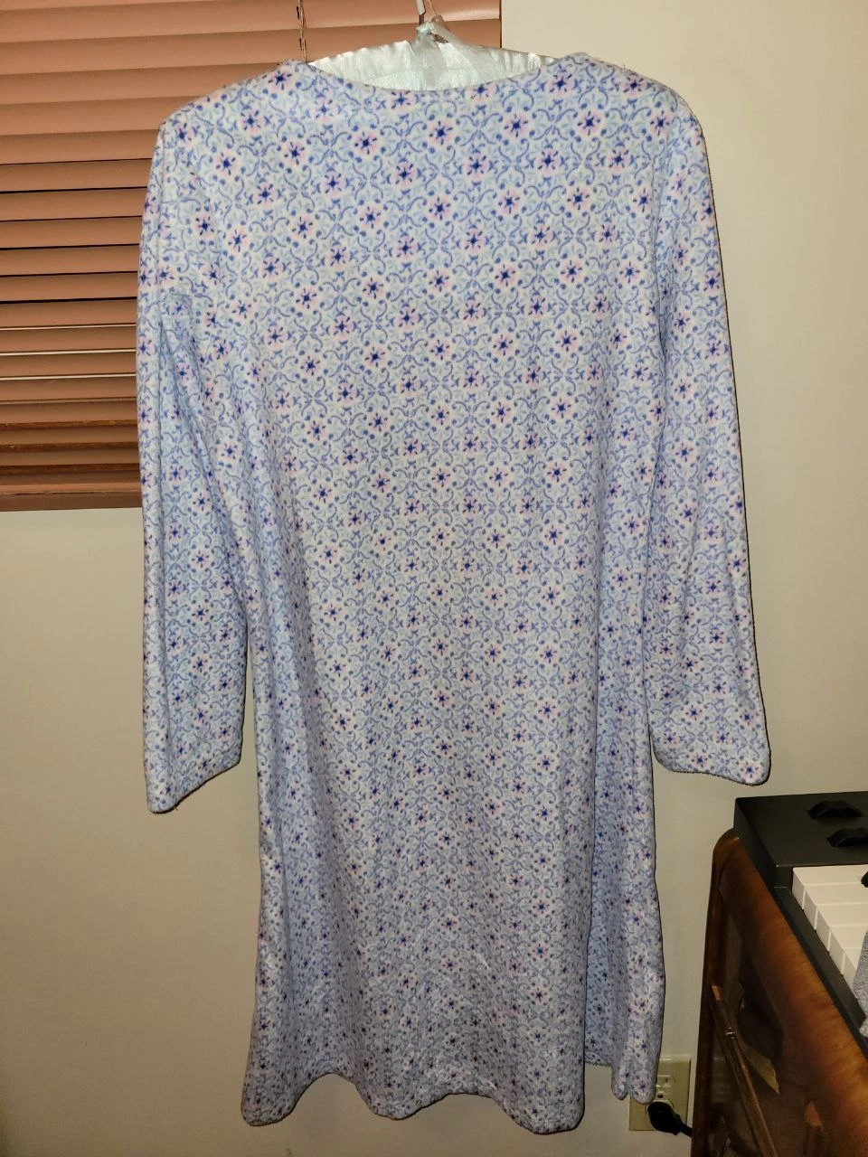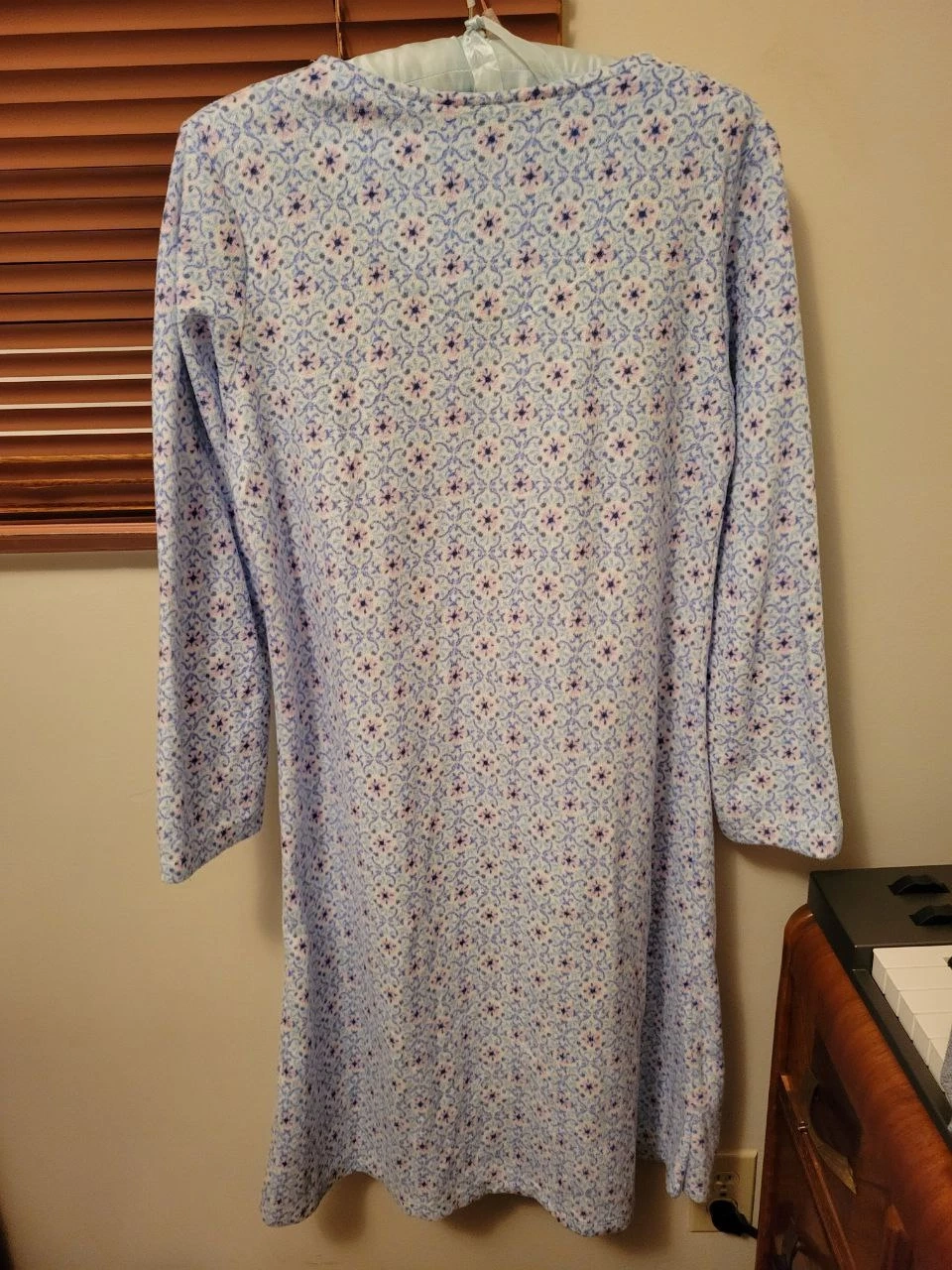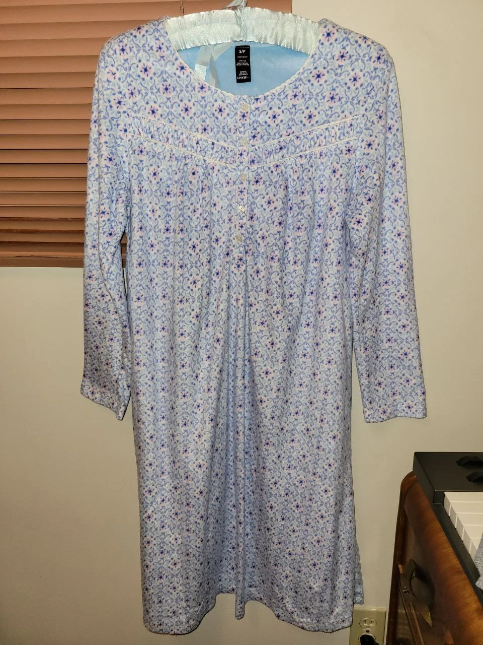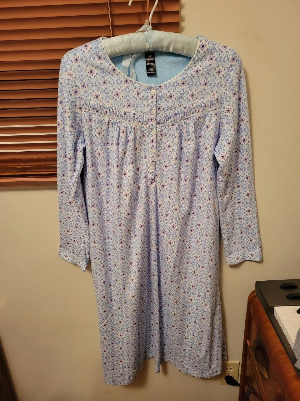 17Here's a comfy George nightgown in size small! It's a pretty blue colour with a floral pattern. Made of 100% polyester, it's lightweight and easy to care for. Machine wash cold and tumble dry low. Barely ever worn. Perfect for feeling warm and cozy on cold winter nights!