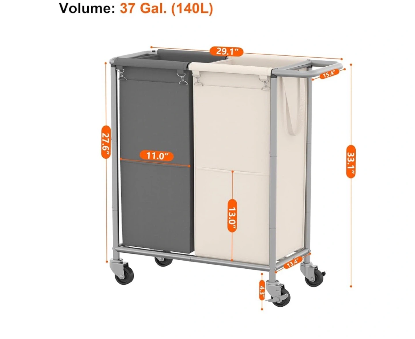 This dual laundry hamper has a total volume of 37 Gal. (140L). It's made with a metal frame and fabric bags. Dimensions are 29.1" L x 15.4" W x 33.1" H. The bags are removable and washable. It's great for sorting laundry!