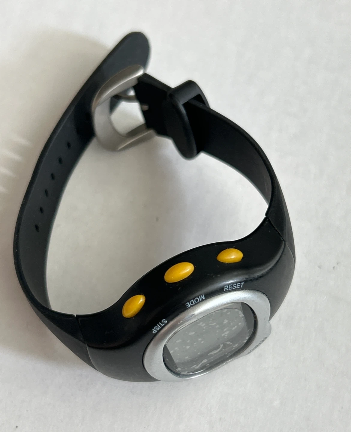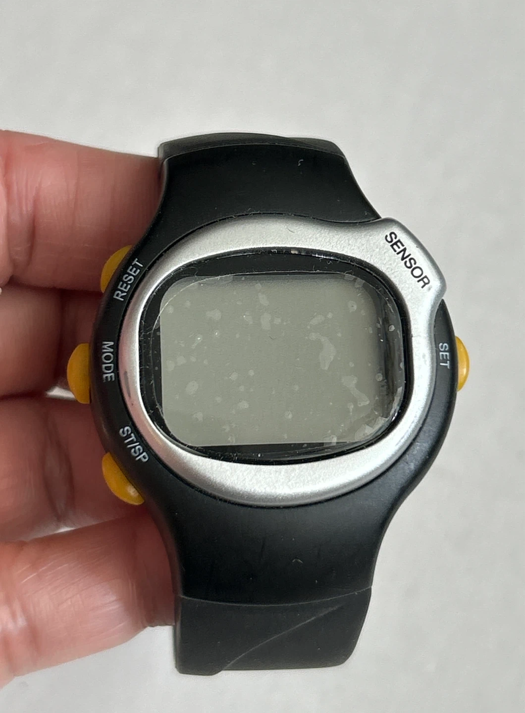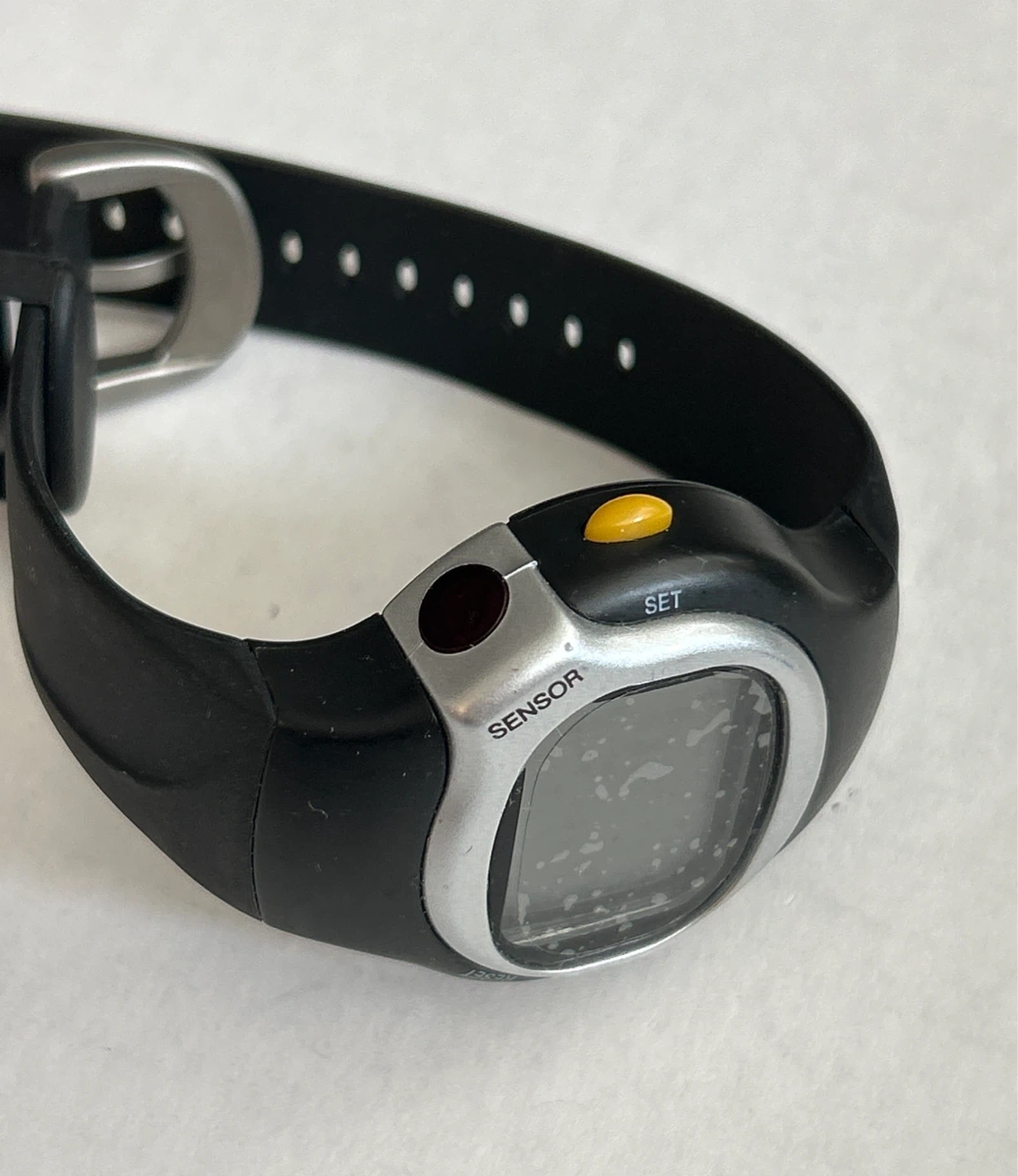 Black digital sports sensor watch with a black silicone band. Features include a sensor and multiple buttons for mode selection and setting. It's a durable choice for everyday use or workouts. Still have the plastic cover on it. Could also need a new battery.