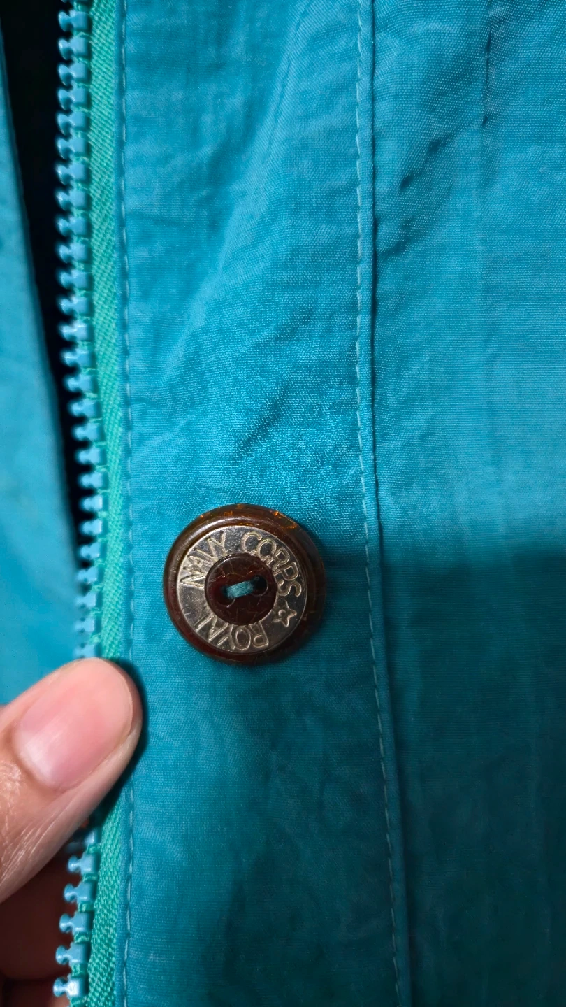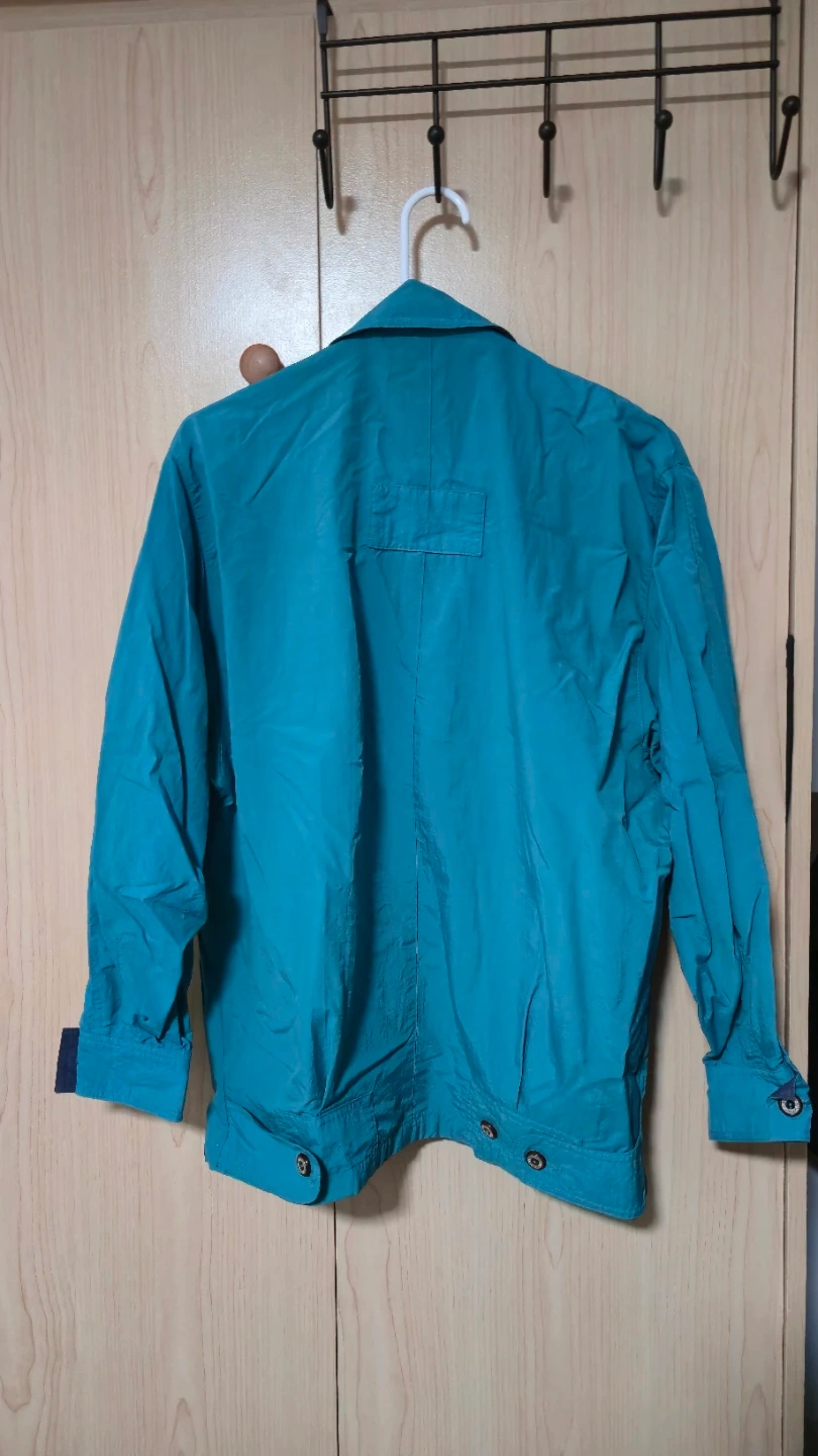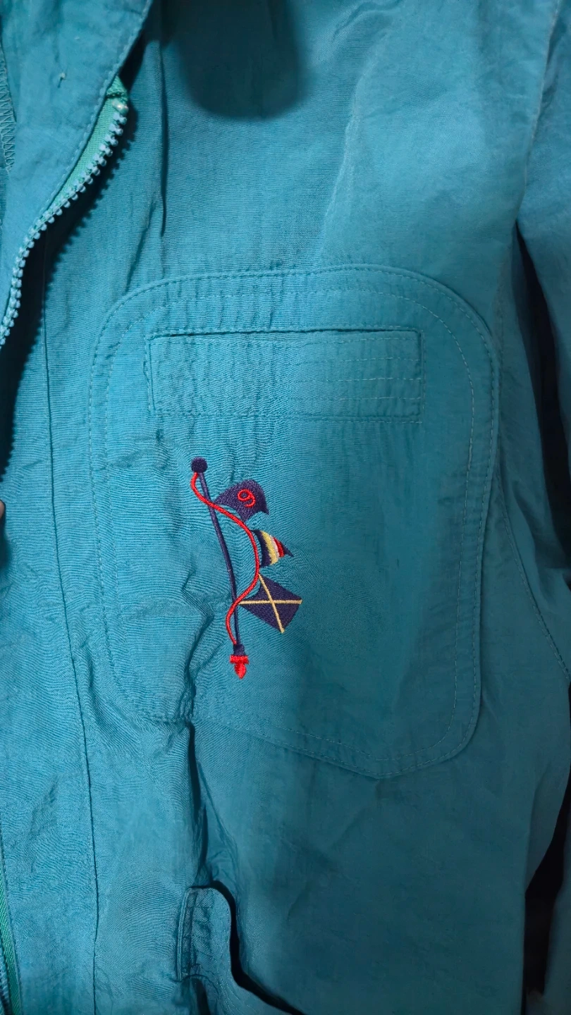 This teal jacket is in great shape and features a unique embroidered design on the pocket. It has a zipper closure and button details. Perfect for adding a pop of colour to your wardrobe!