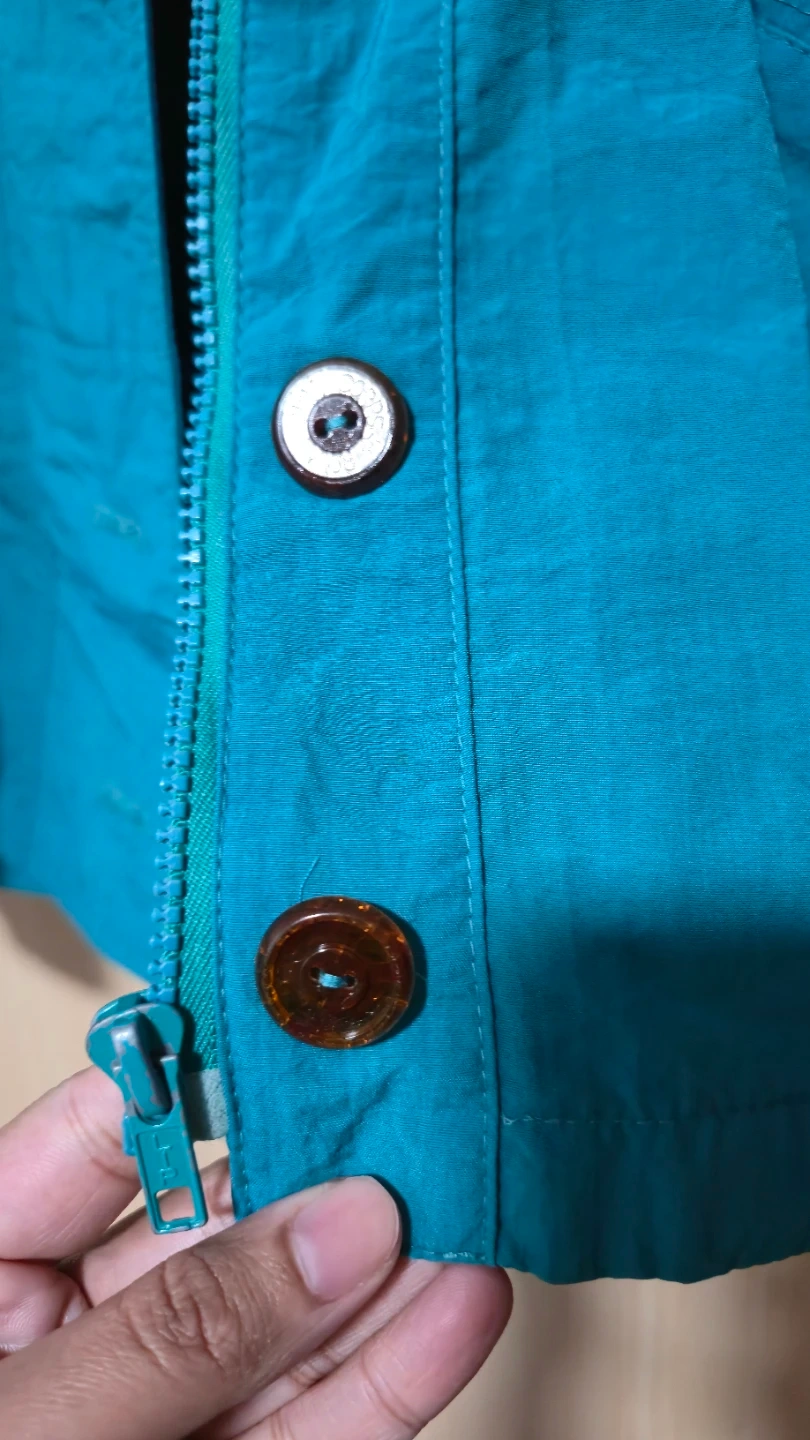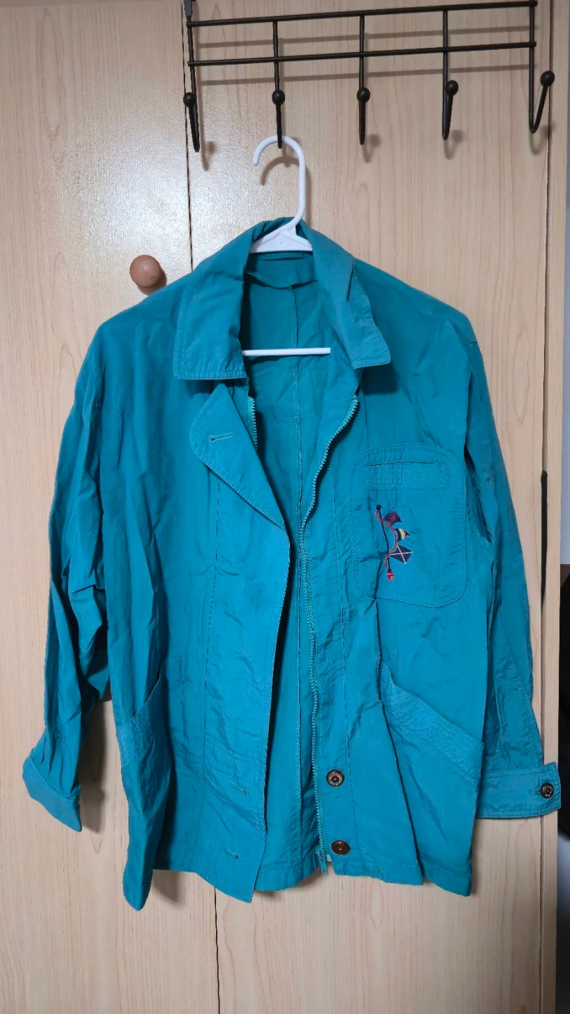 This teal jacket is in great shape and features a unique embroidered design on the pocket. It has a zipper closure and button details. Perfect for adding a pop of colour to your wardrobe!