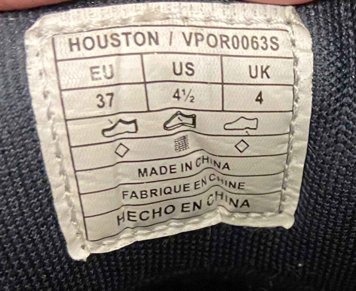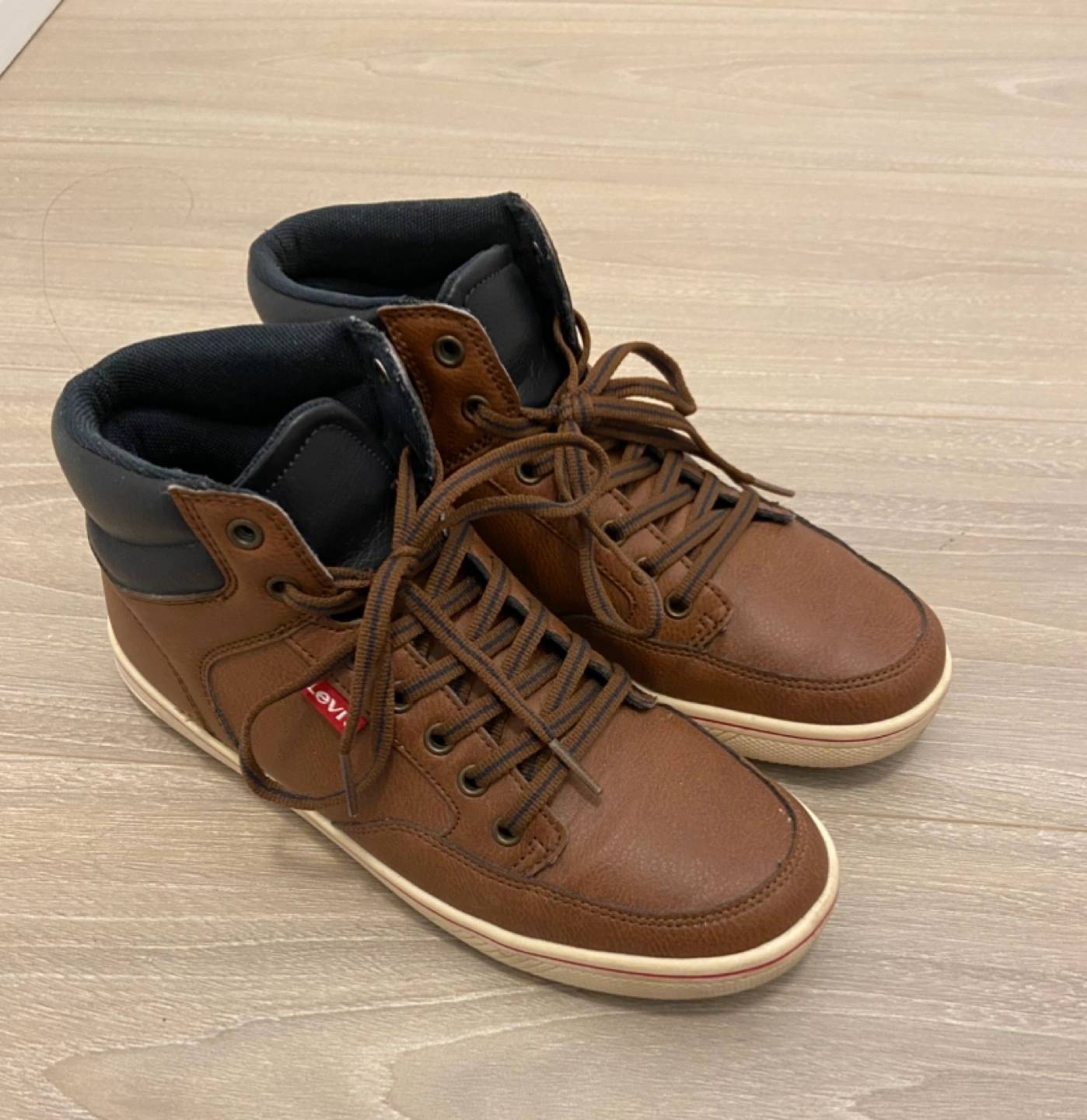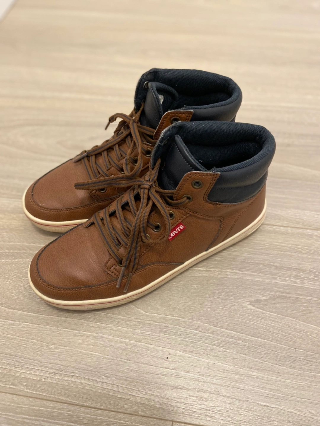 Pair of brown leather high top sneakers. Lace-up closure. Cream coloured sole. Dark navy blue accents.
