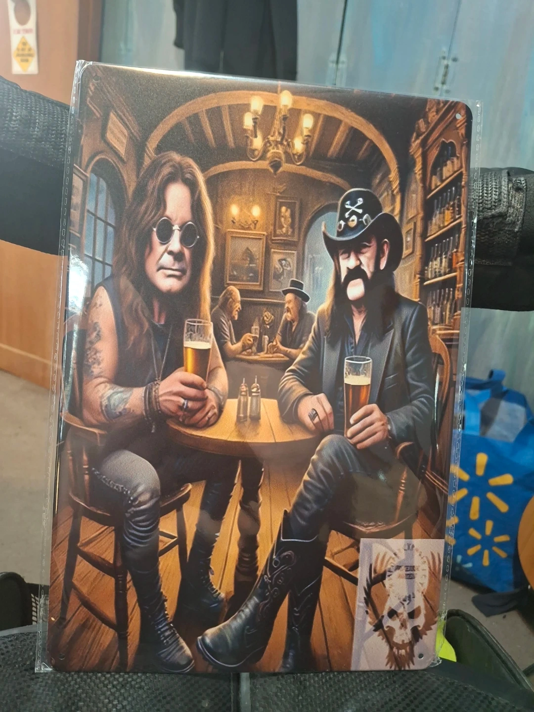 Metal wall sign featuring Ozzy Osbourne and Lemmy Kilmister. Perfect for any rock and roll fan's bar or rec room. This decorative piece brings a classic vibe to your space!