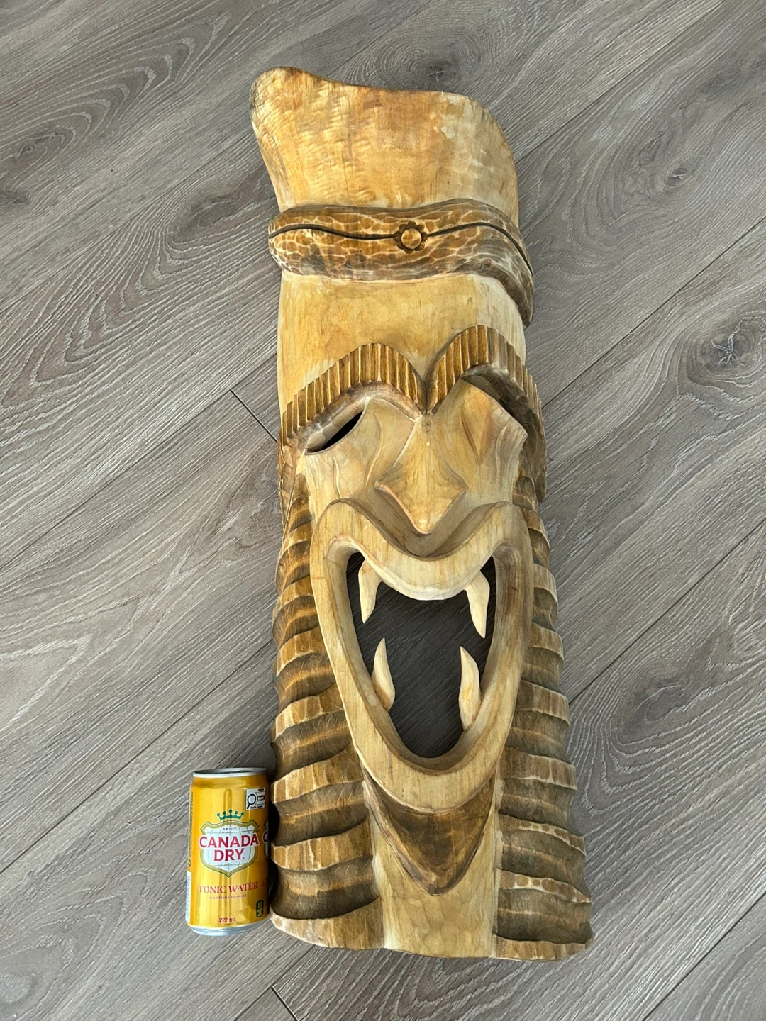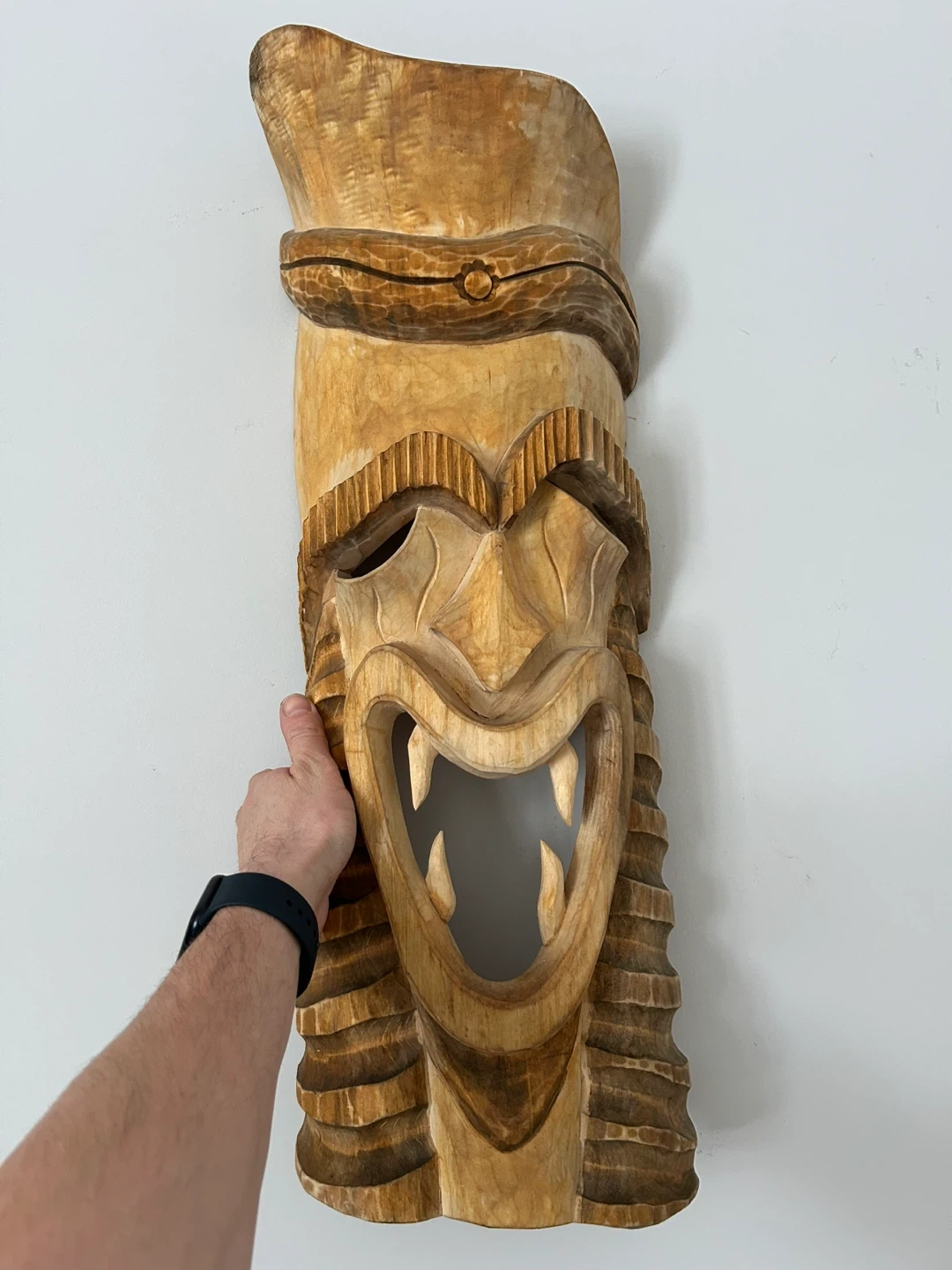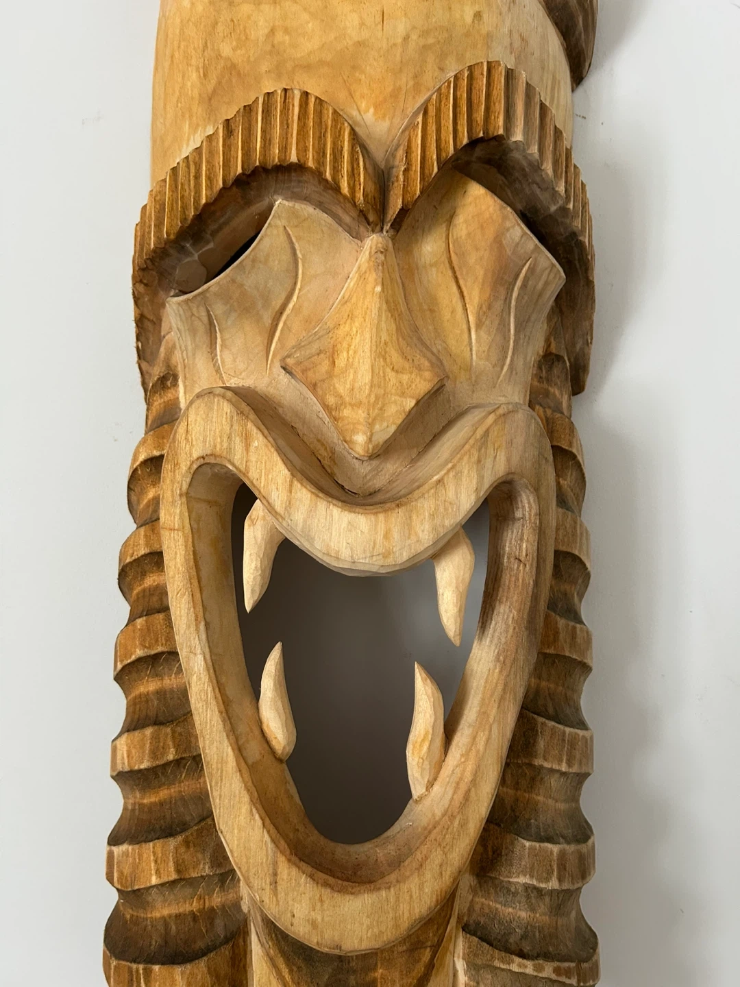 A striking hand-carved wooden Tiki mask, perfect for adding a bold South Pacific vibe to your home, patio, or tiki bar. This 26-inch mask features a traditional Polynesian-inspired “warrior” design with a fierce open-mouthed expression, detailed fangs, and intricate geometric carvings.