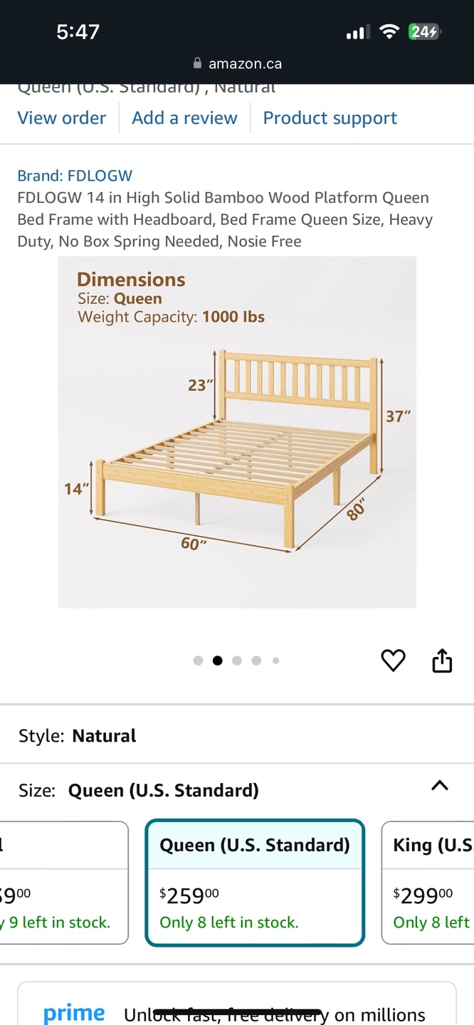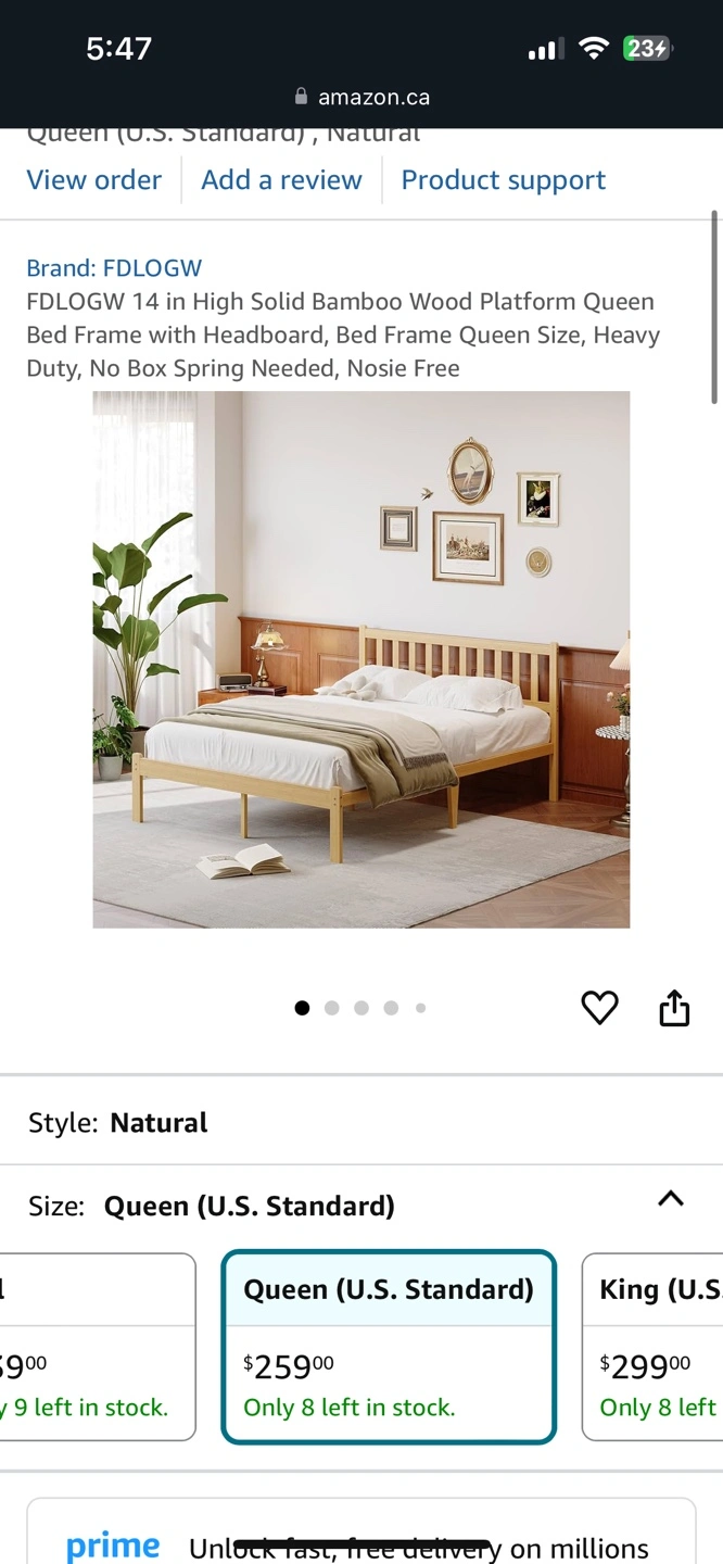 Solid bamboo wood platform bed frame. Queen size. Headboard included. Heavy duty. No box spring needed. Easy assembly. Noise free.