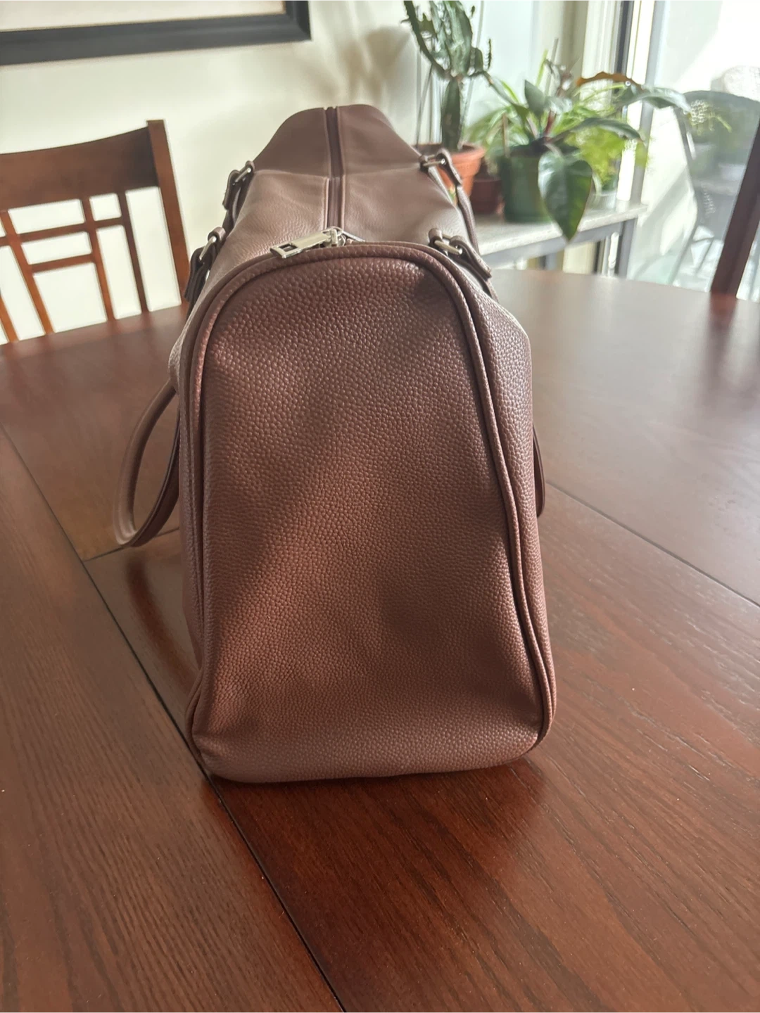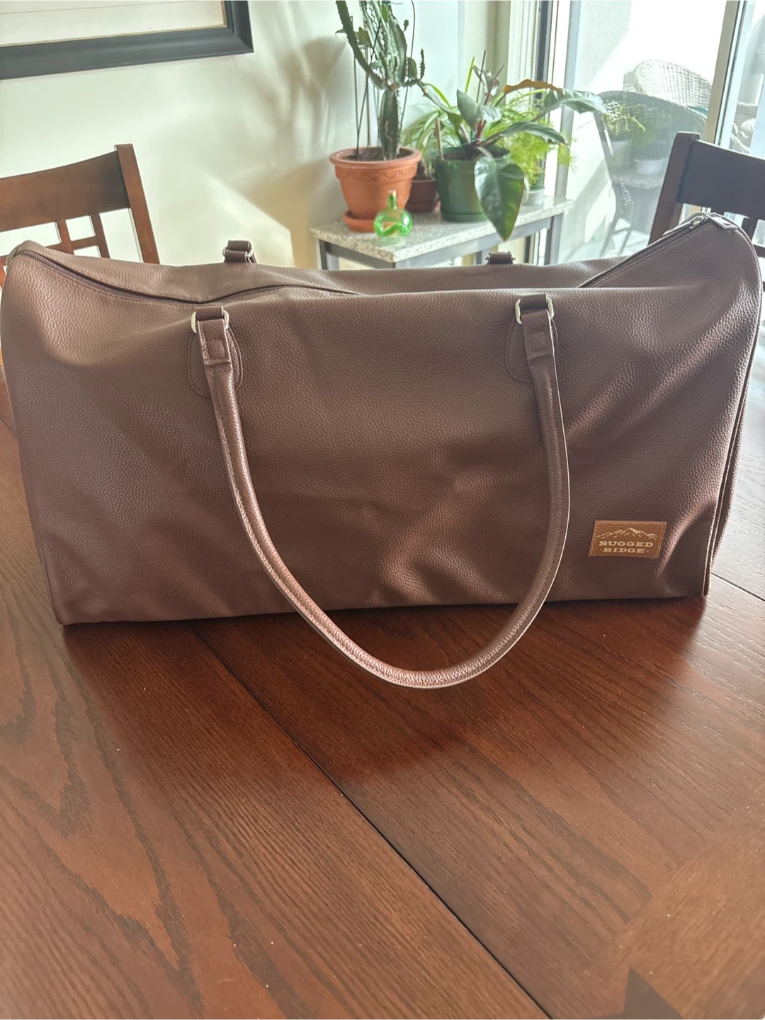 Brown faux leather duffle bag by Rugged Ridge. It has sturdy handles and a zippered closure. This bag is suitable for weekend trips or gym use. Brand new.