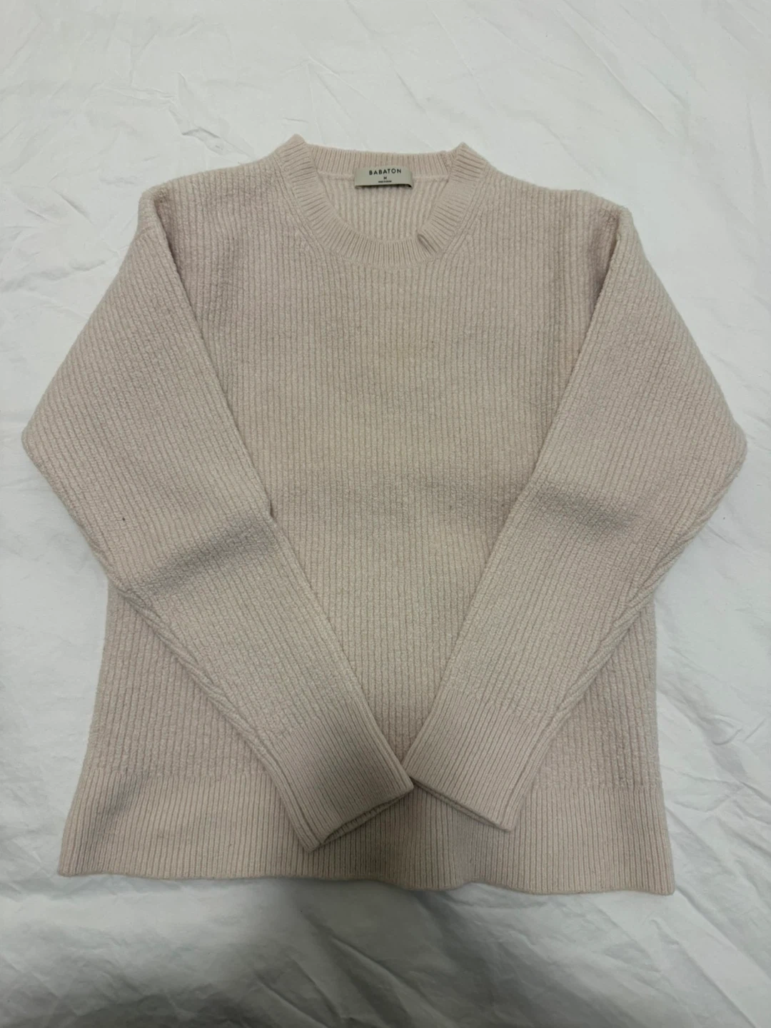 A cream-coloured Babaton sweater with a ribbed texture and mock neck. It's a size medium and made of 100% merino wool, exclusive of elastic. This sweater's comfortable material makes it a cozy choice for cooler weather.