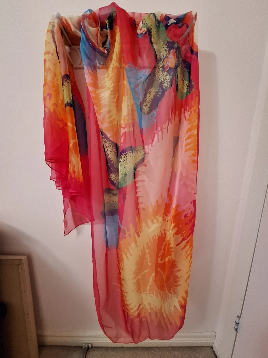 A brightly coloured sheer scarf with a vibrant abstract floral print. It's made of lightweight fabric. This scarf would be a lovely addition to many outfits!