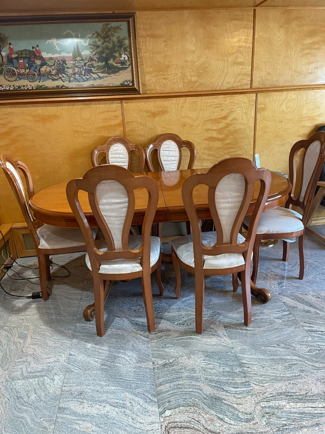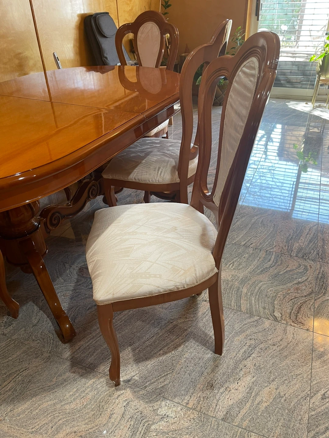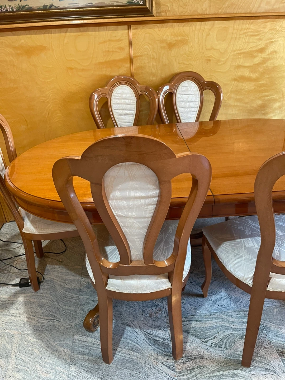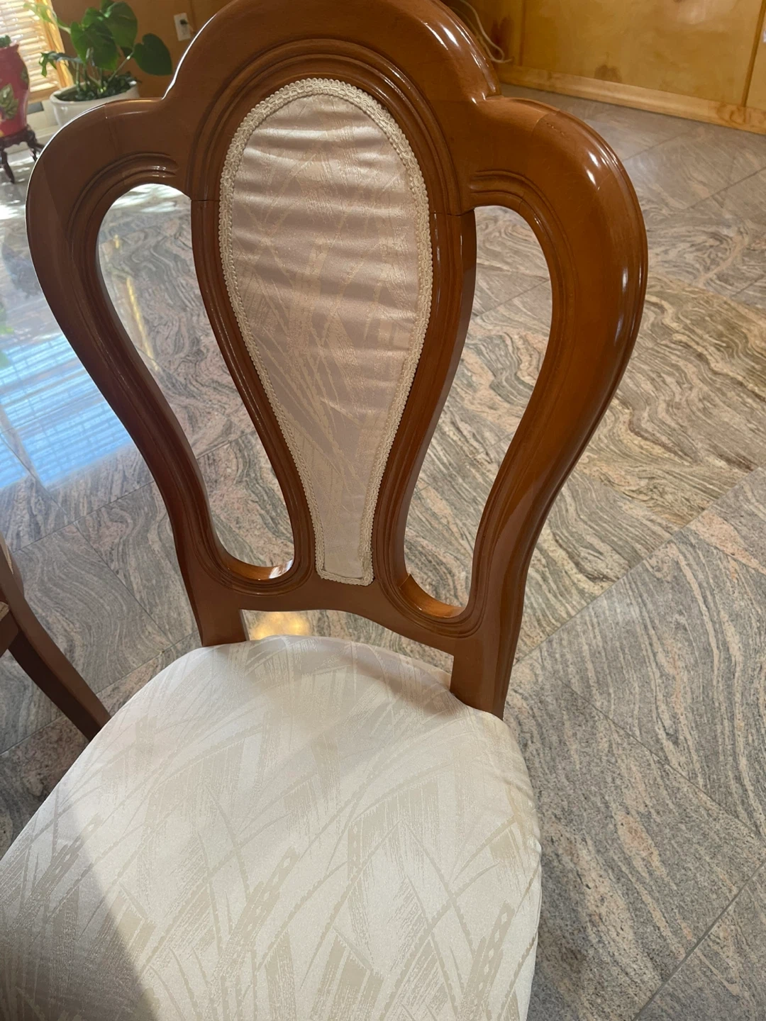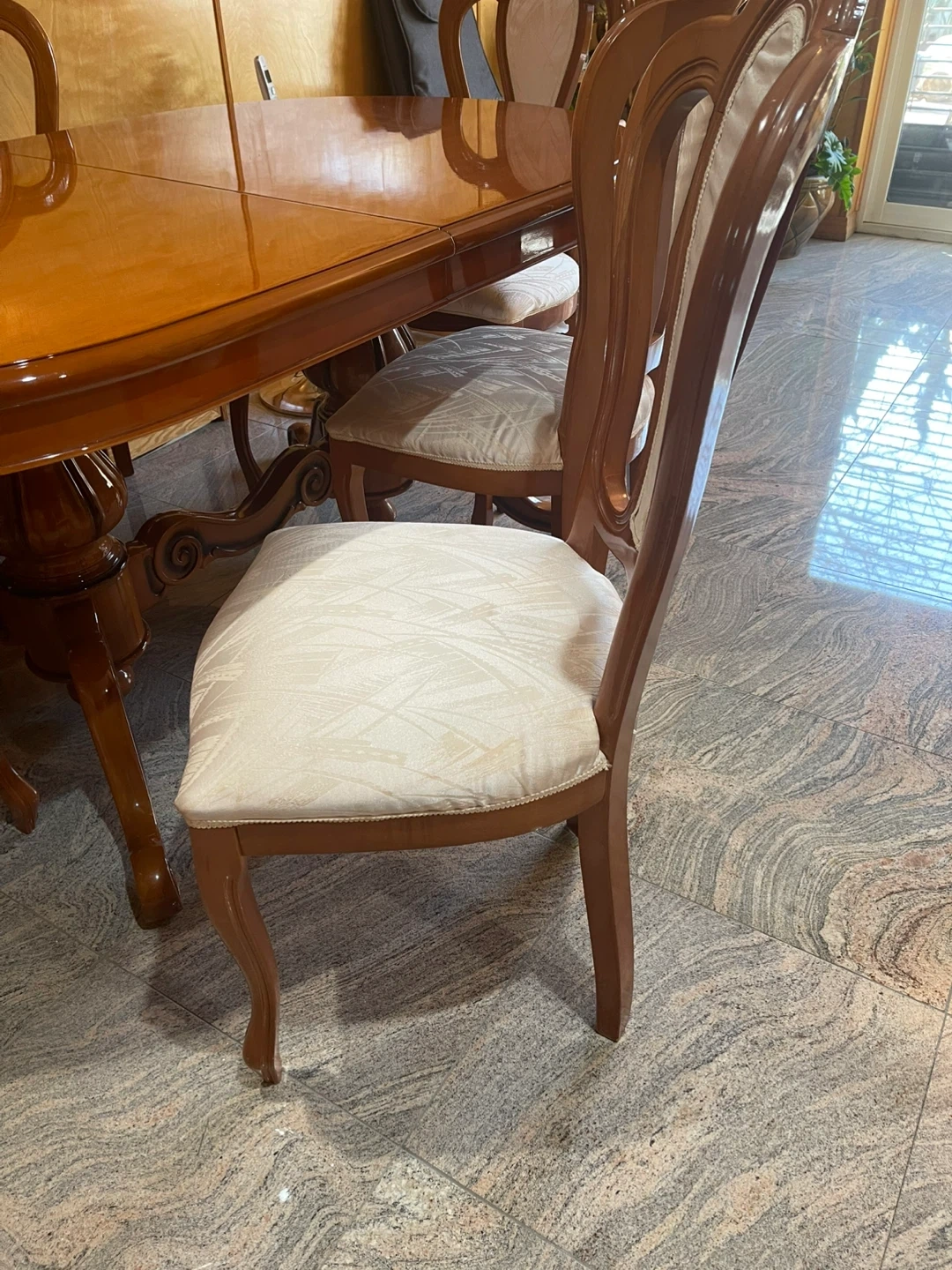 Selling a set of wood table and 6 chairs. They feature a beautiful wood frame and a light colored fabric seat and back. Perfect for completing your dining set!