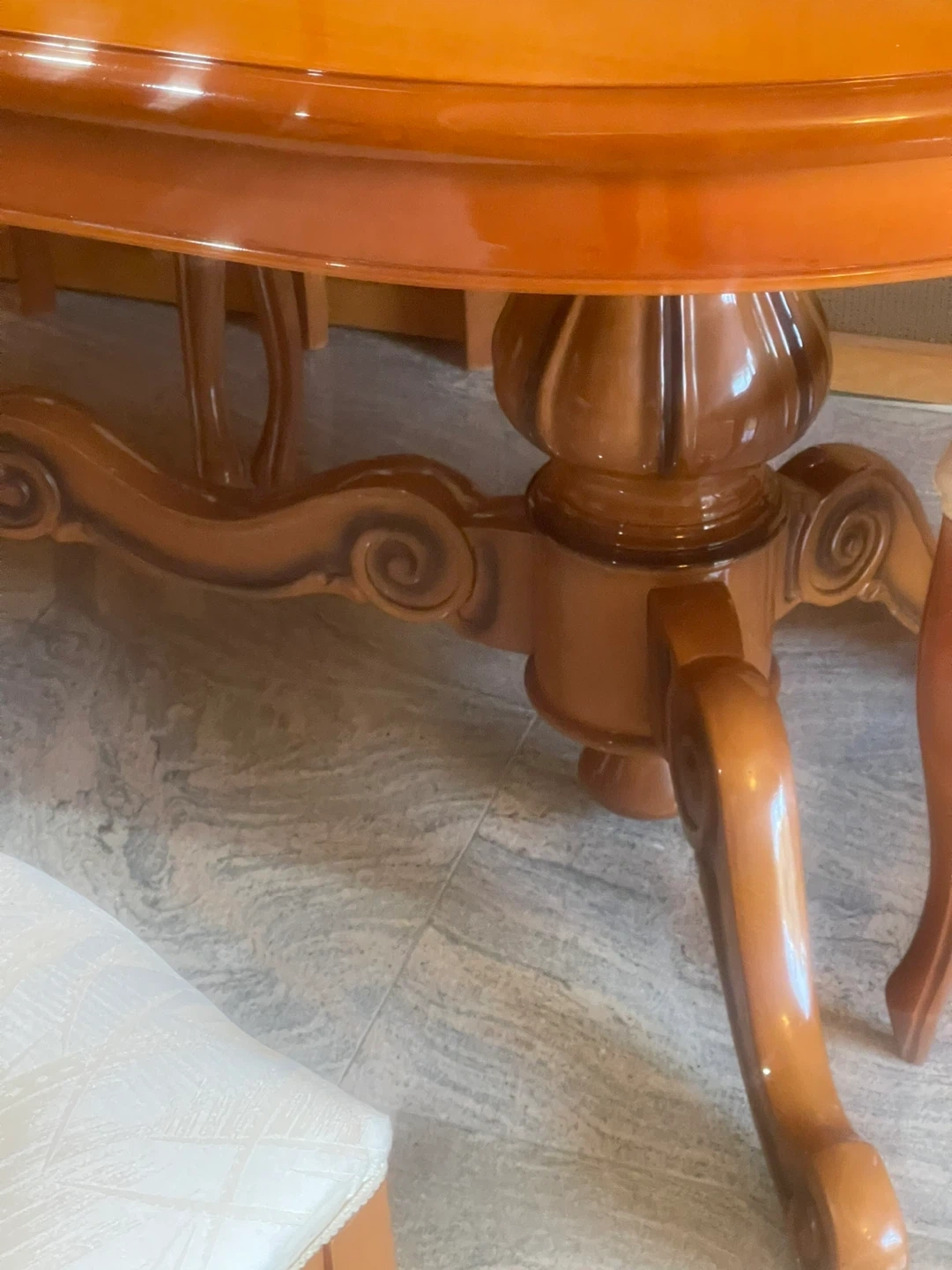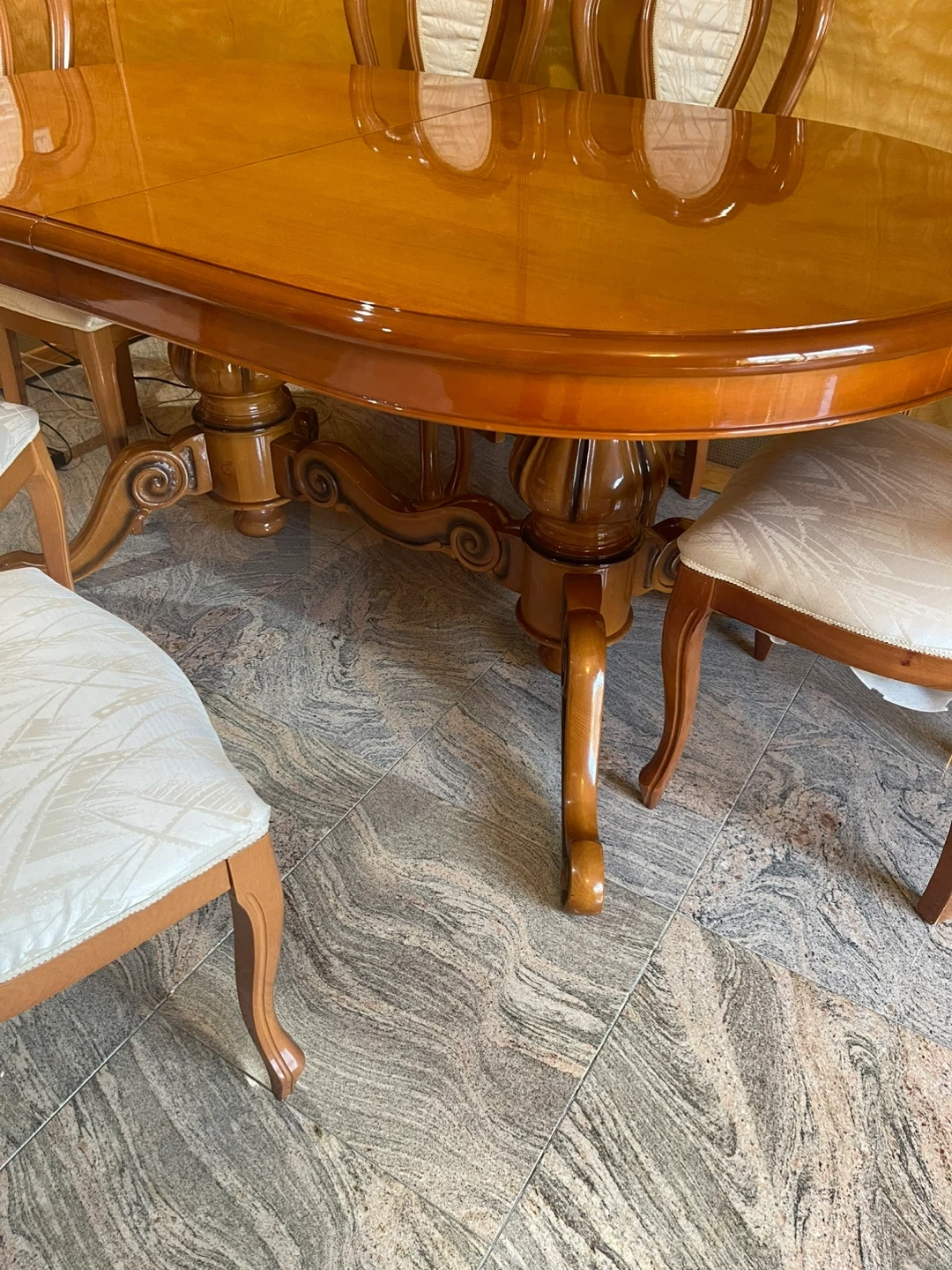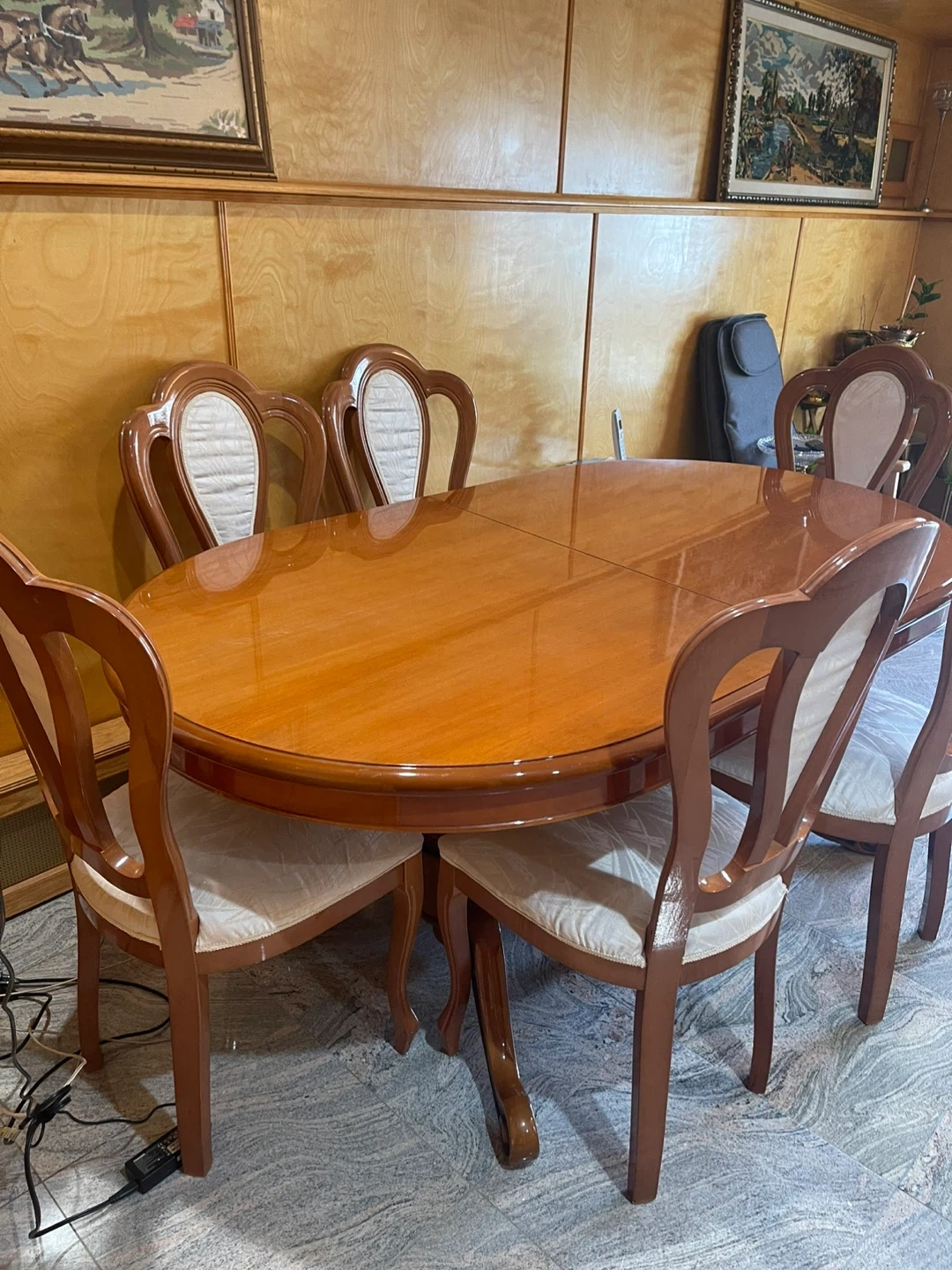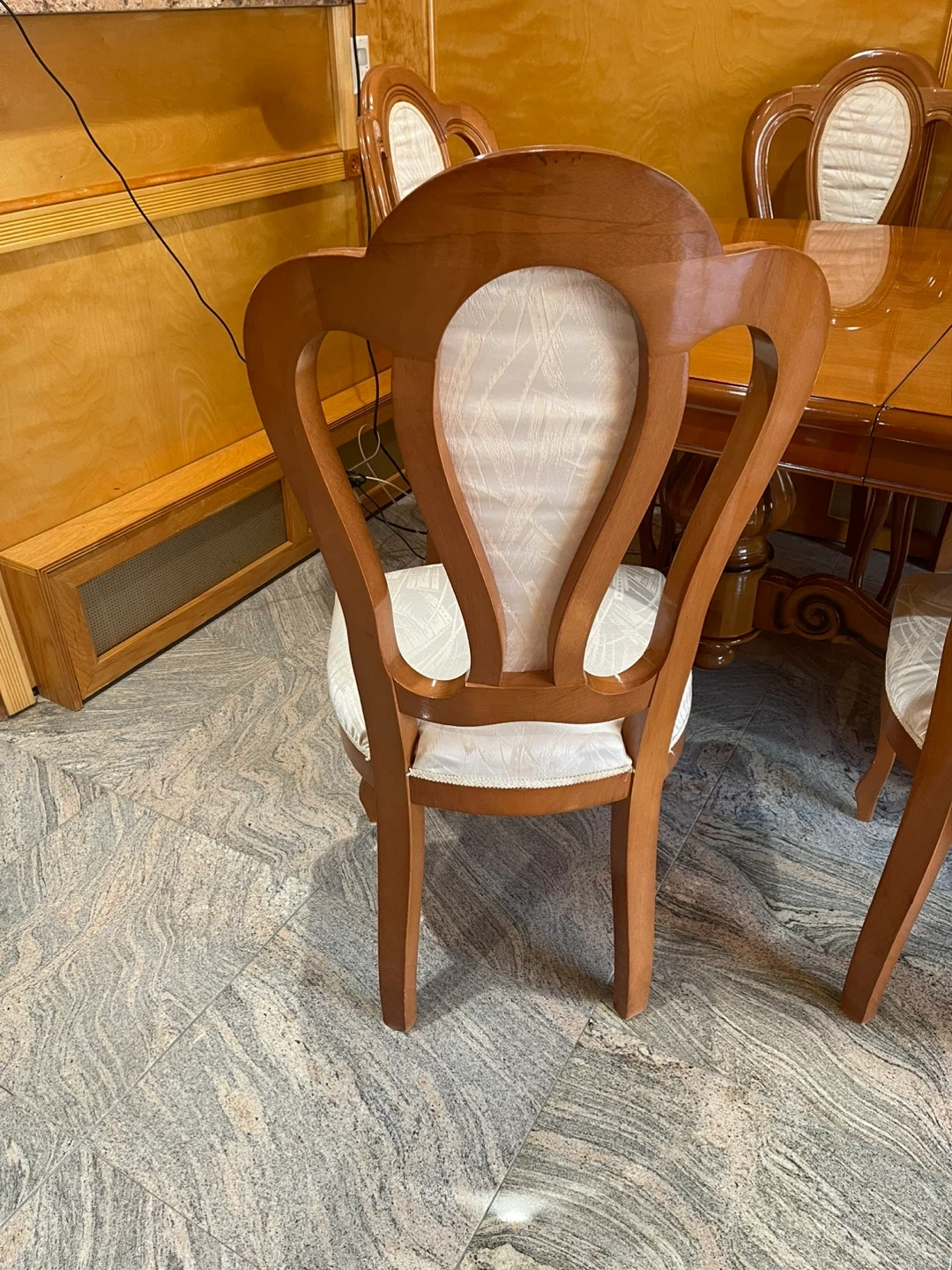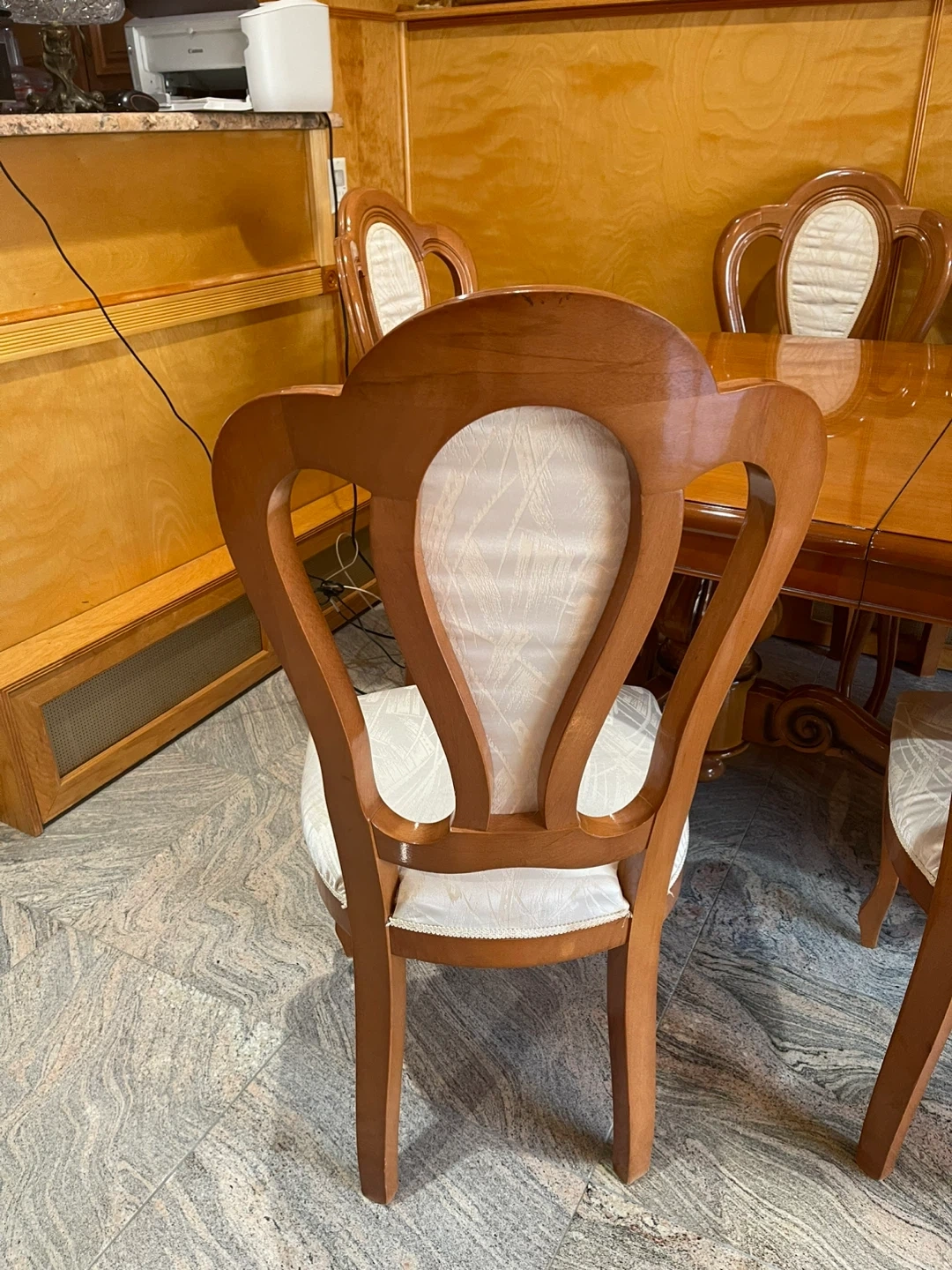 Selling a set of wood table and 6 chairs. They feature a beautiful wood frame and a light colored fabric seat and back. Perfect for completing your dining set!