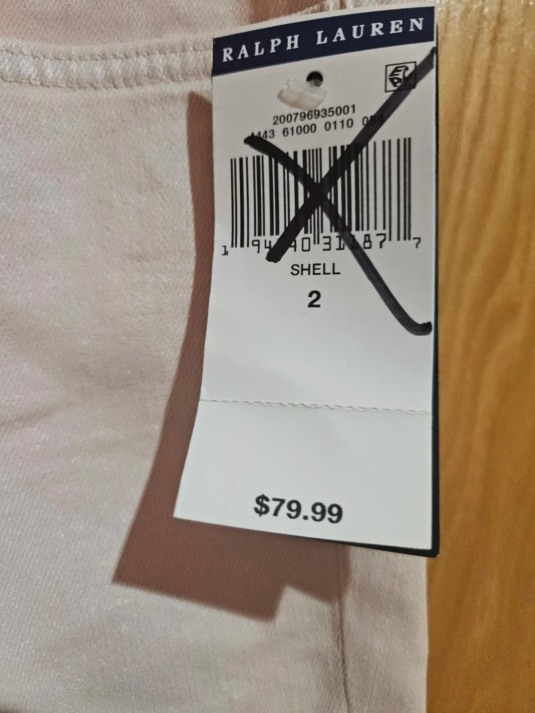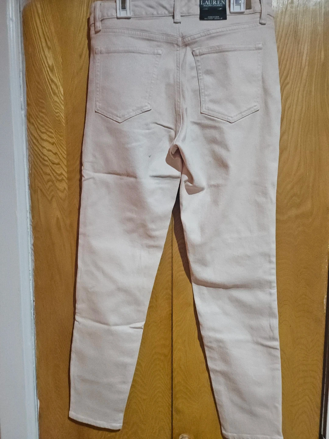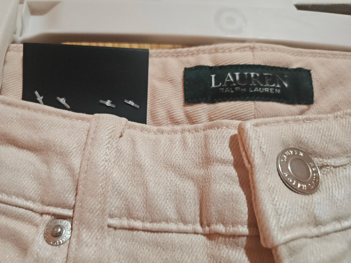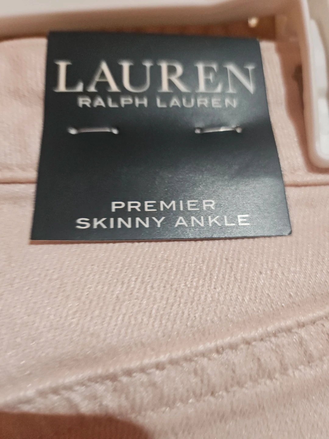 These are Lauren Ralph Lauren Premier Skinny Ankle jeans. They're size 2 and a light pink color. The fabric is a cotton blend.