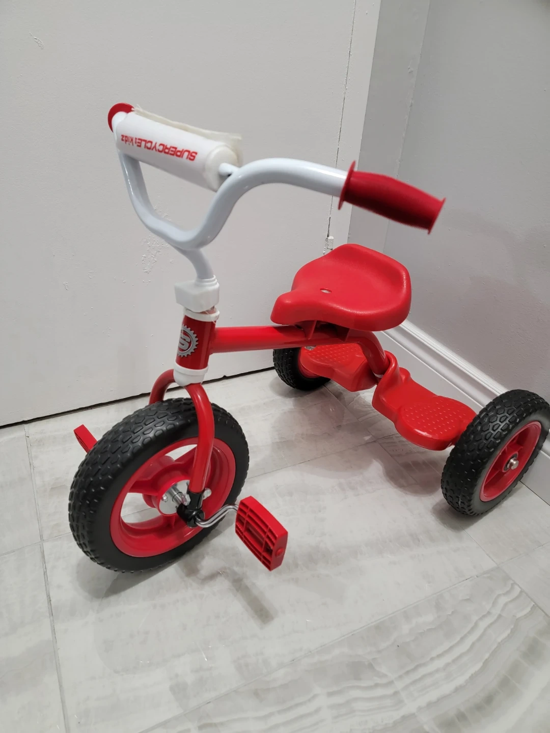 This red Supercycle Kidz tricycle is perfect for little ones starting to explore. It features sturdy pedals and comfortable handlebars. Great for outdoor fun!