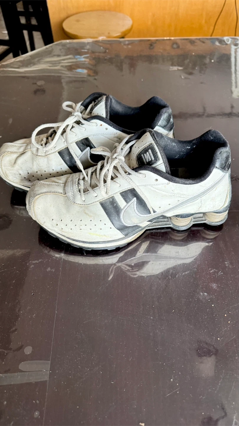 White and black Nike Shox running shoes. Lace-up closure with synthetic leather and mesh upper. Shows some signs of wear and dirt. Great for casual wear or light training!