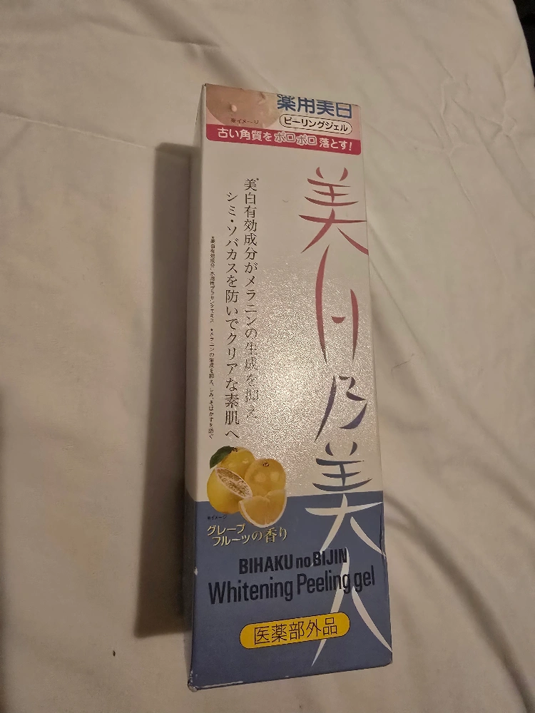 A whitening peeling gel box with Japanese text on the packaging. A box with a fresh, fruity scent. You can unwind while giving your skin a treat.
