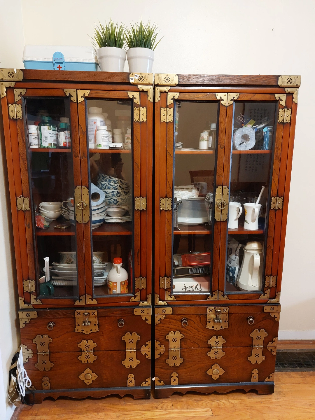 Selling a beautiful Korean antique-style display cabinet. It has a unique design with brass-coloured metal accents and a rich wood finish. Perfect for adding a touch of traditional charm to your home! It was made in Korea in 2002. 2 pieces . no broken part.
