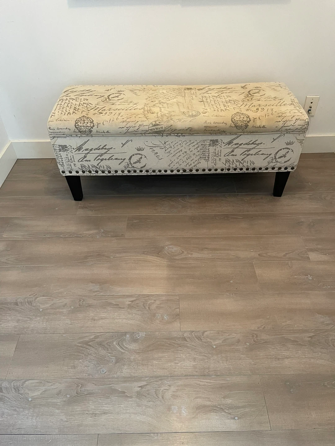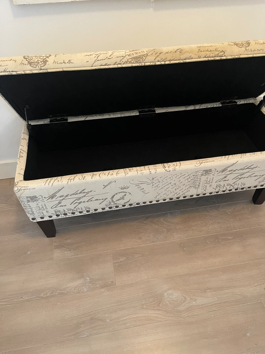 This storage ottoman bench features a charming French script design. It's upholstered with decorative nailhead trim and has dark wooden legs. The lid lifts to reveal ample storage space inside.