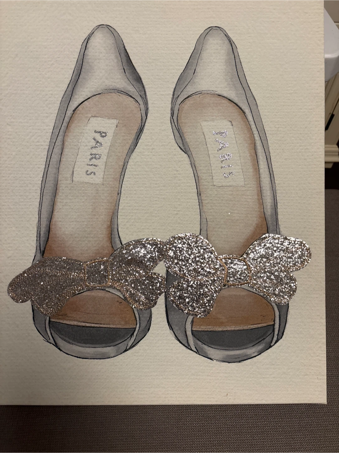 This charming canvas art features a watercolour painting of silver peep-toe heels adorned with sparkling glitter bows. The art is stretched over a wooden frame, ready to hang. It's a lovely piece for a bedroom or dressing area!