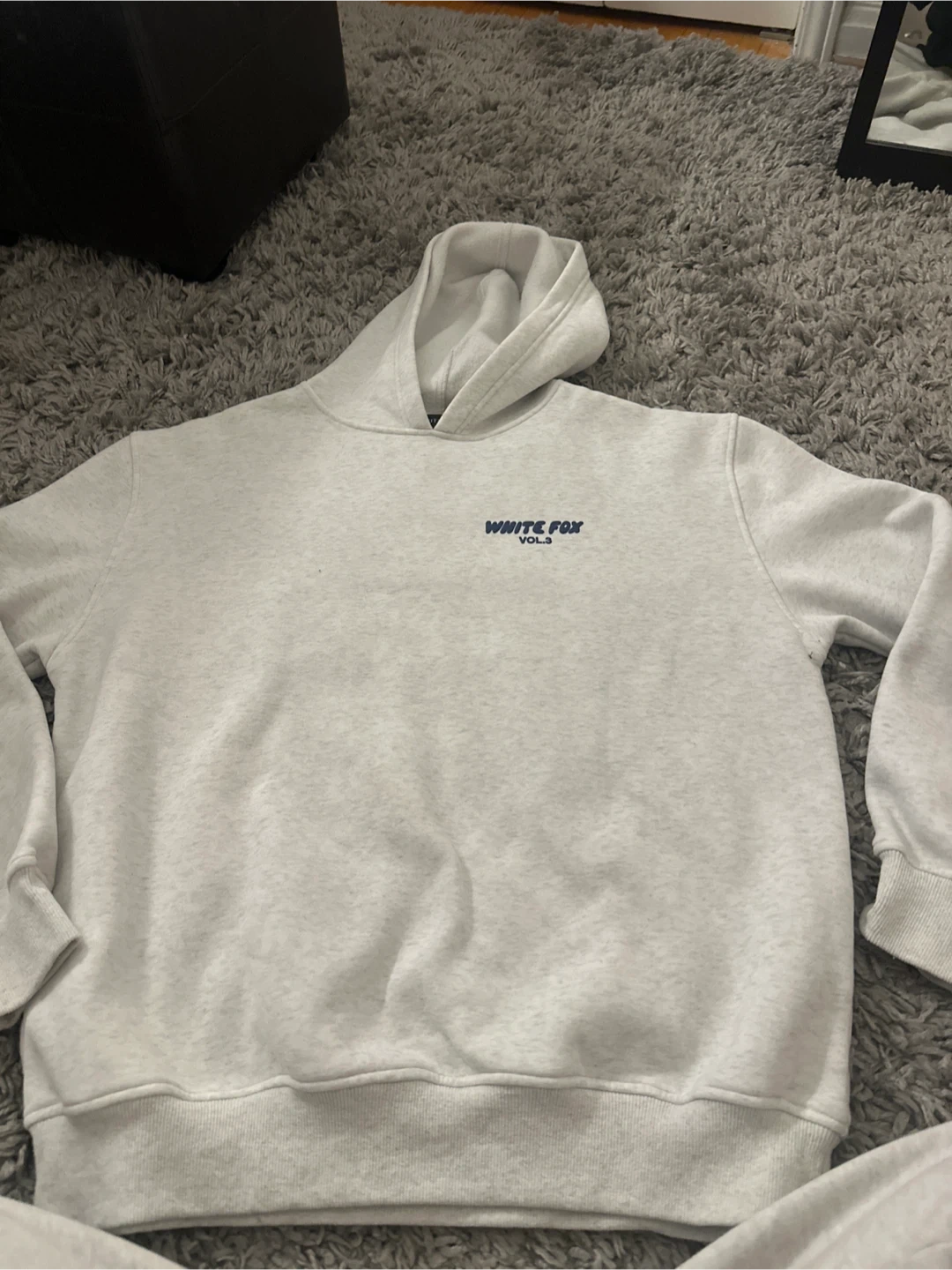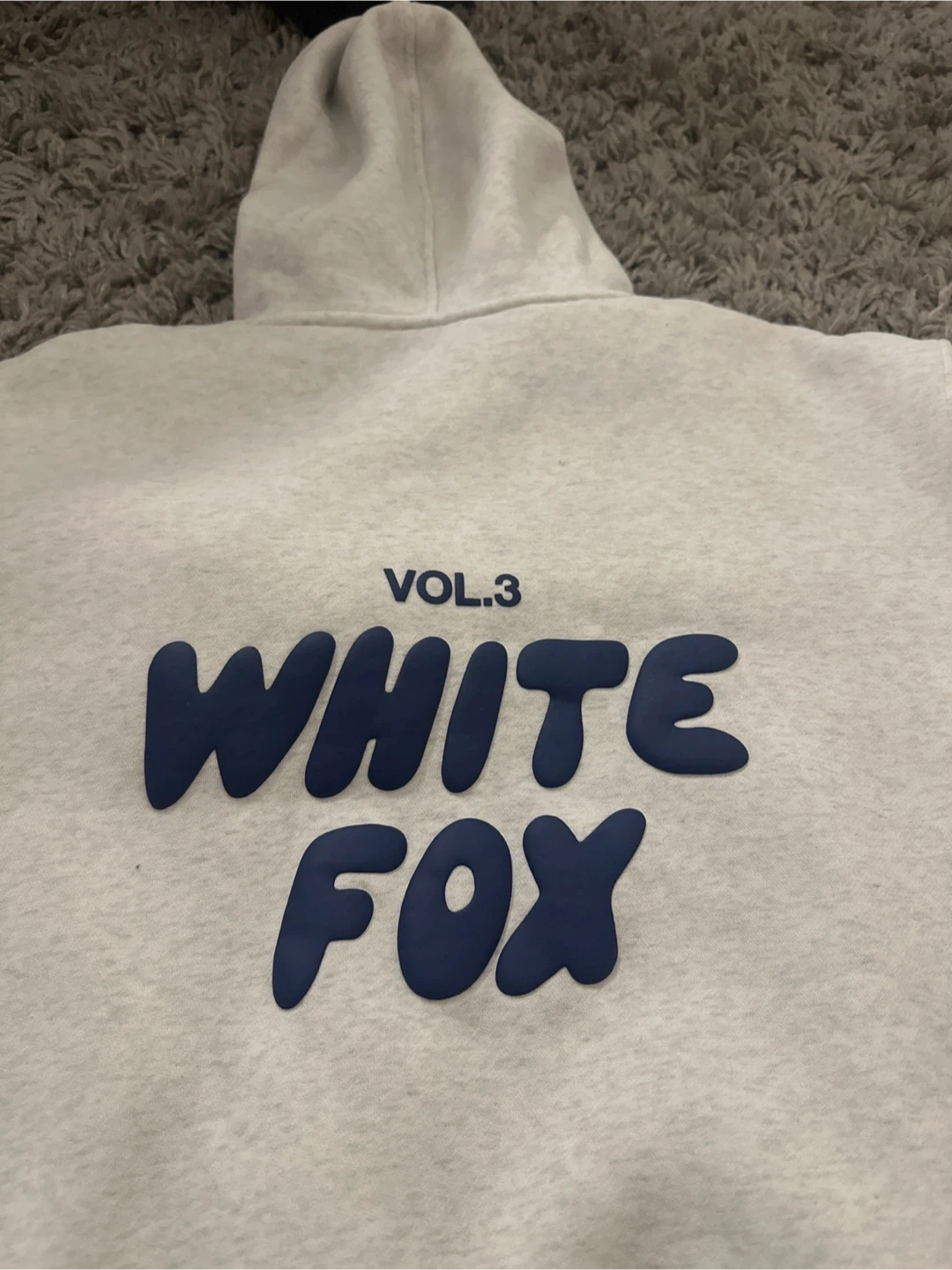 This is a White Fox Vol. 3 hoodie. It's a light heather grey colour with dark blue lettering. Made of a soft, comfortable material.
