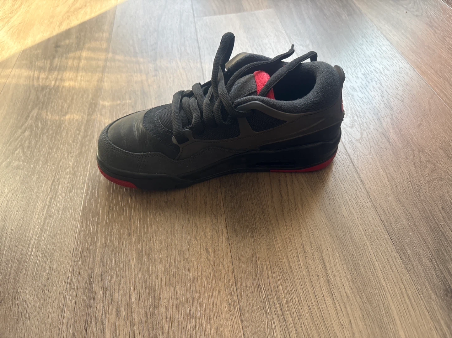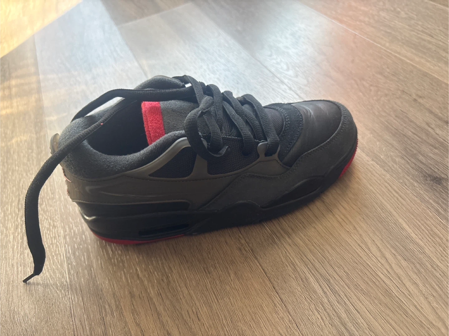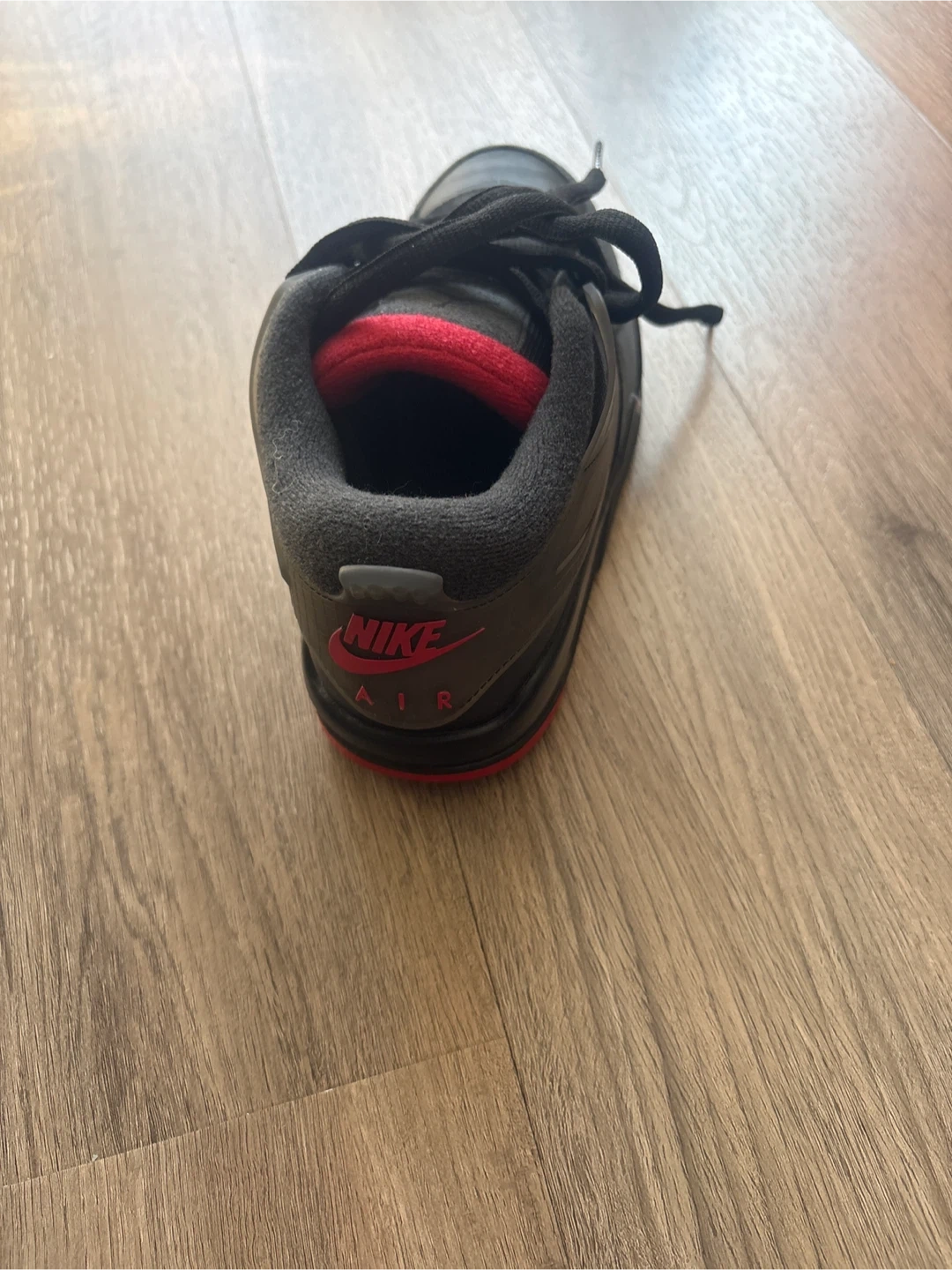 These are black Nike Air sneakers with red accents. They come with laces and are in their original box.