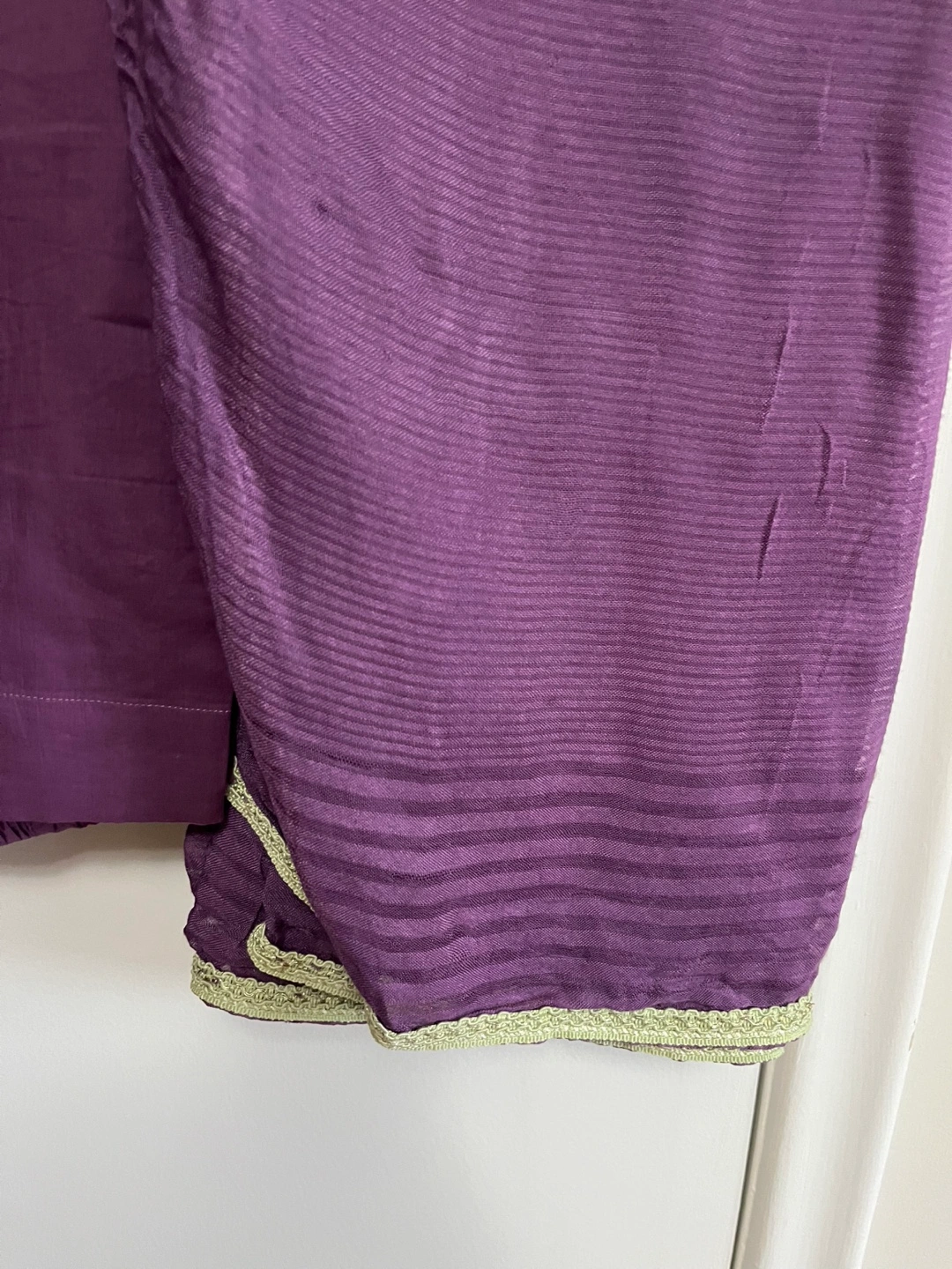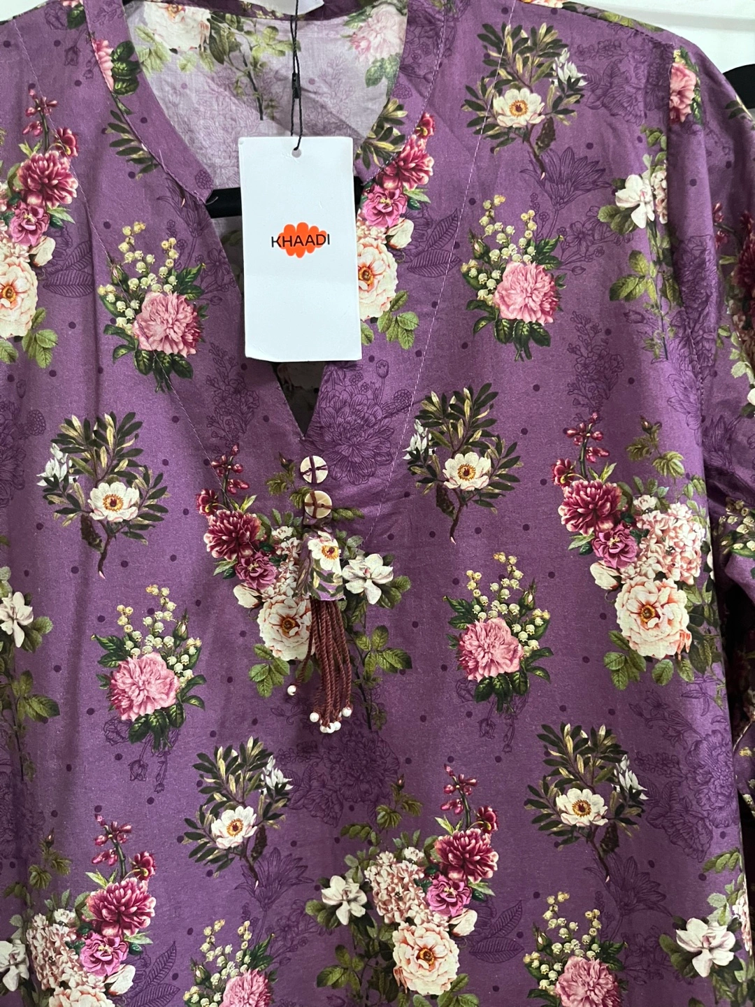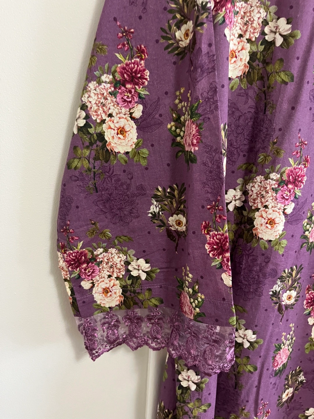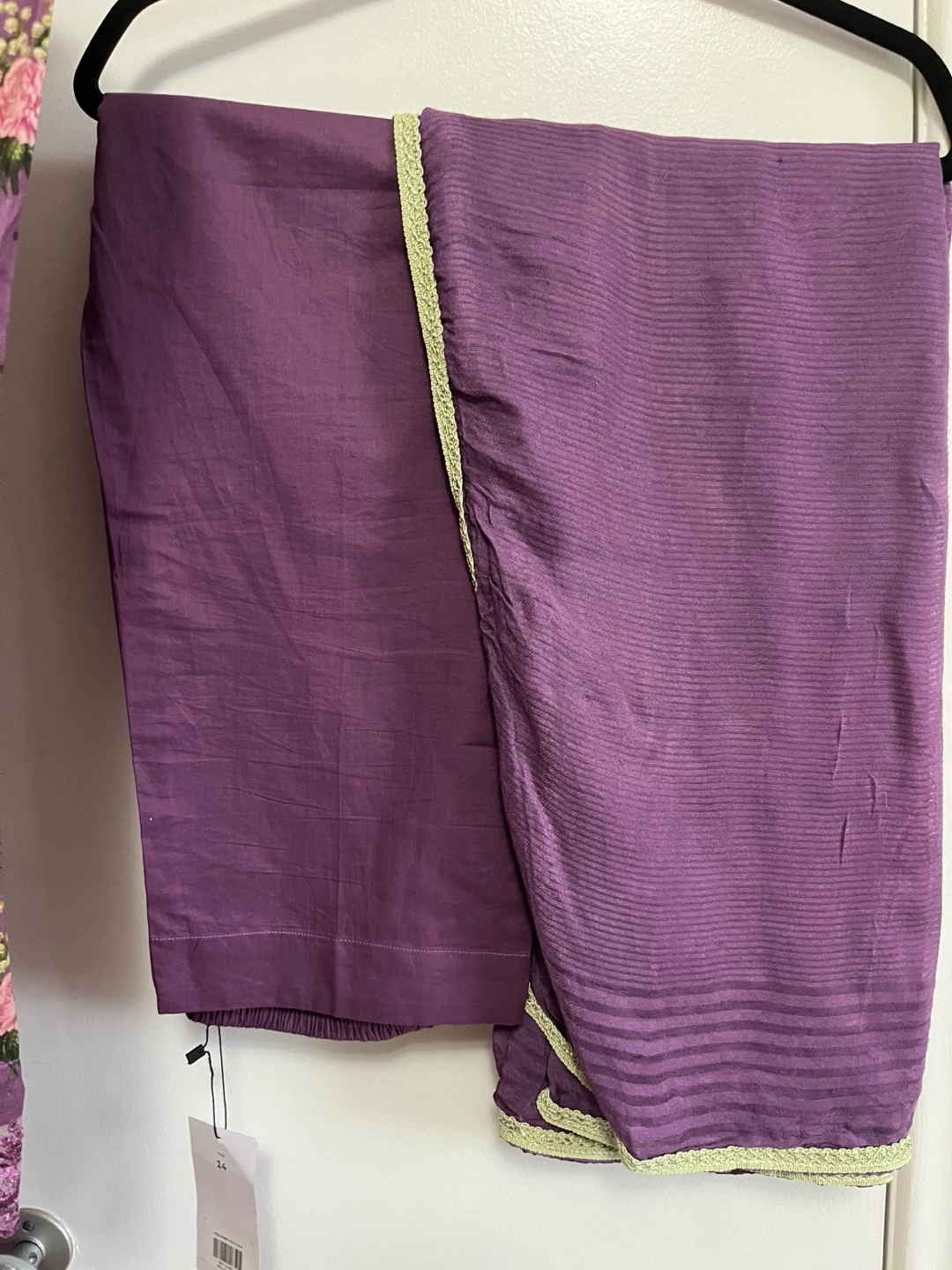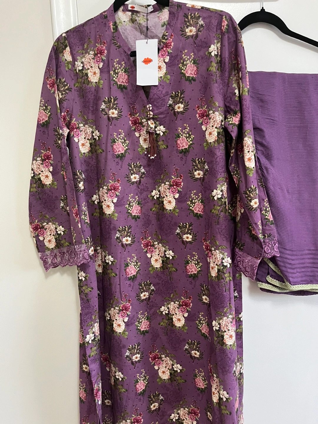 Beautiful purple floral print three-piece suit. Features a long-sleeved kurta, trousers, and dupatta. Delicate lace detailing on sleeves and dupatta. New with tags.
