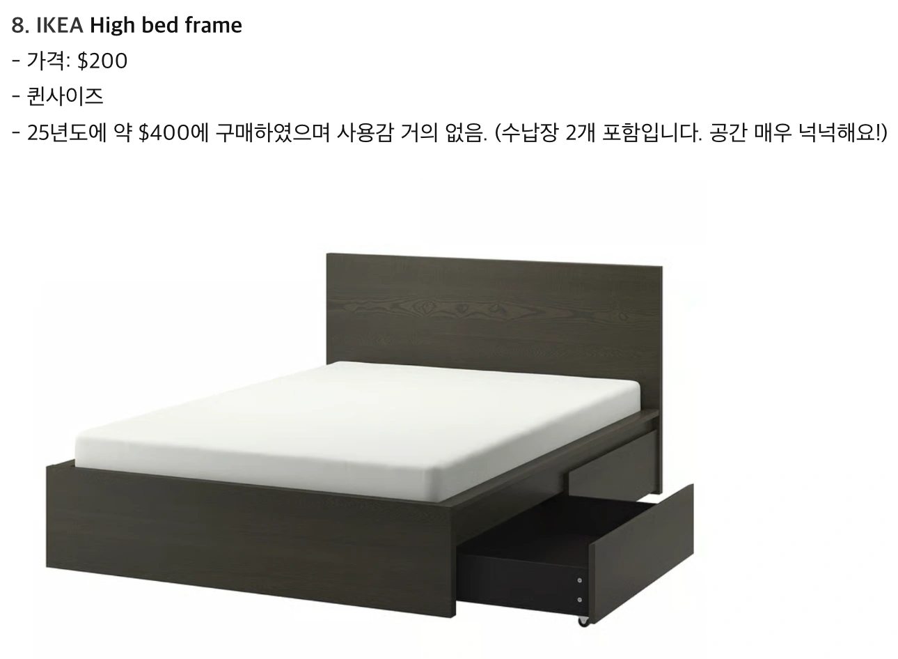 Selling an IKEA high bed frame in queen size. It's in great condition and includes two storage drawers! It's very spacious, and I originally bought it for around $429. (Pick up Only!)