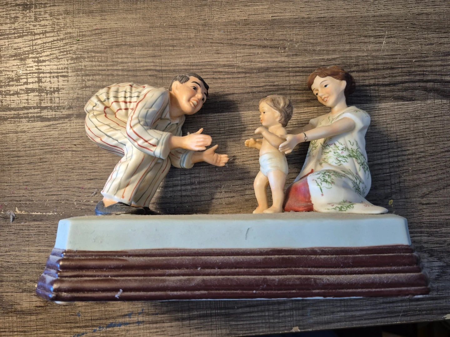This is a vintage Norman Rockwell figurine titled "Baby's First Step". It's inspired by the art of Norman Rockwell and plays the tune "Yes Sir, That's My Baby". It was made in 1986 by Museum Collections, Inc