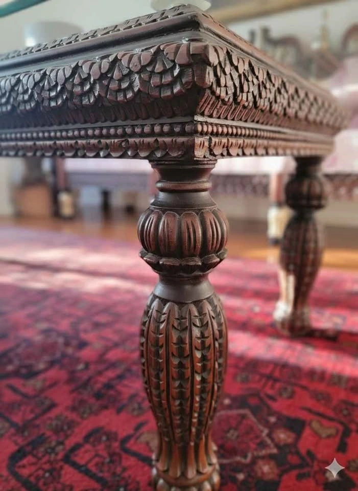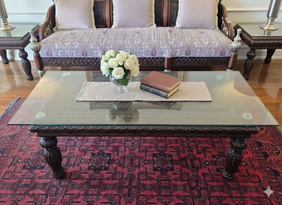 Elevate your home with this masterfully crafted 3-piece furniture set. Featuring one large coffee table and two matching side tables, each piece is made from solid rosewood and showcases breathtaking, deep-relief hand carvings. Intricate Detail: Elaborate floral and geometric carvings cover the table surfaces and legs. Premium Build: Durable rosewood construction with a rich, dark finish. Practical Luxury: All tables include custom-fitted glass tops to protect the woodwork while keeping it visible. Excellent Condition: Well-preserved set that adds a touch of global elegance to any room.