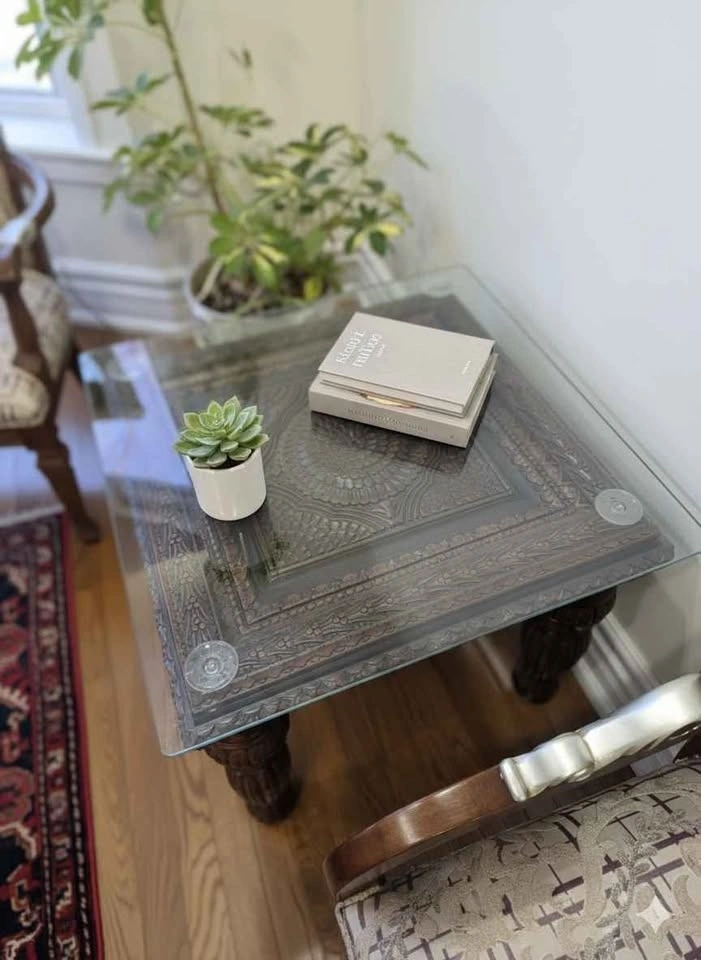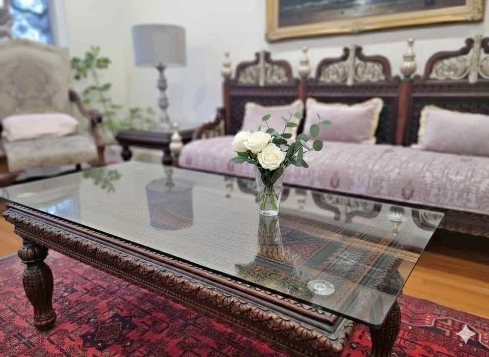 Elevate your home with this masterfully crafted 3-piece furniture set. Featuring one large coffee table and two matching side tables, each piece is made from solid rosewood and showcases breathtaking, deep-relief hand carvings. Intricate Detail: Elaborate floral and geometric carvings cover the table surfaces and legs. Premium Build: Durable rosewood construction with a rich, dark finish. Practical Luxury: All tables include custom-fitted glass tops to protect the woodwork while keeping it visible. Excellent Condition: Well-preserved set that adds a touch of global elegance to any room.