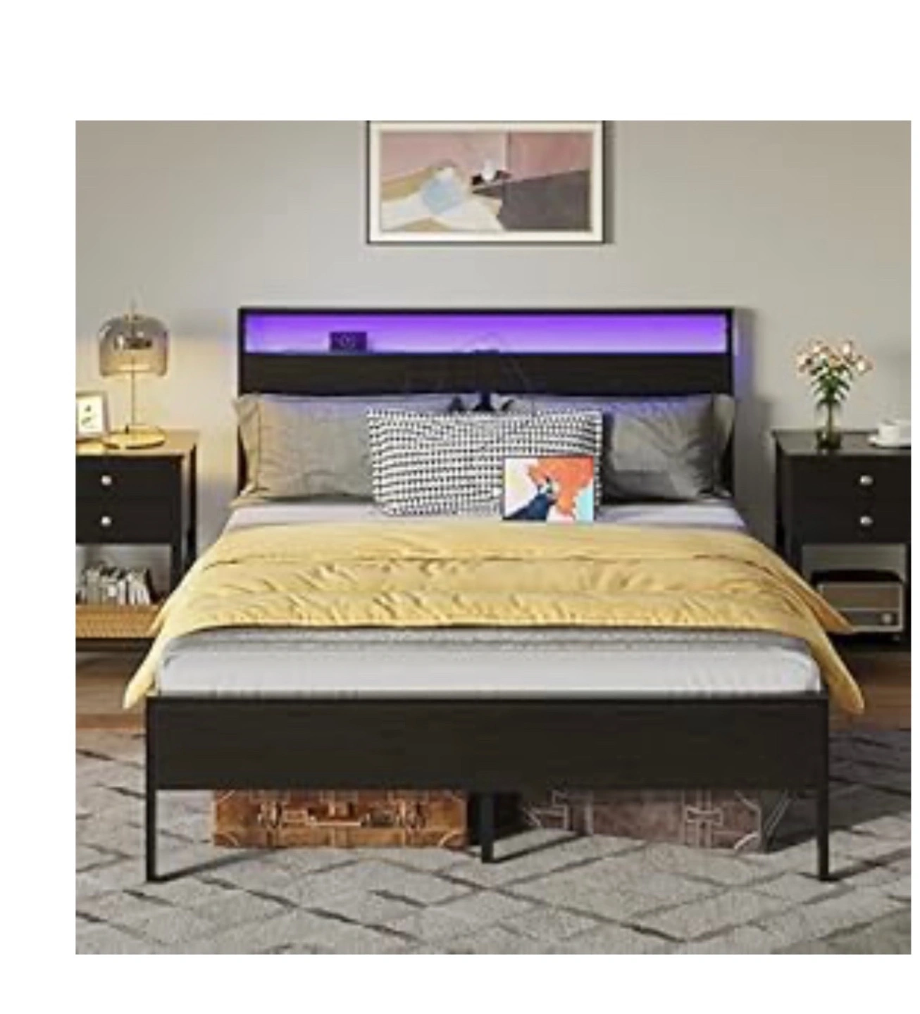 Black metal platform bed frame. LED headboard lights with built in USB charger. Includes side rails. Double size. Brand new in the box.