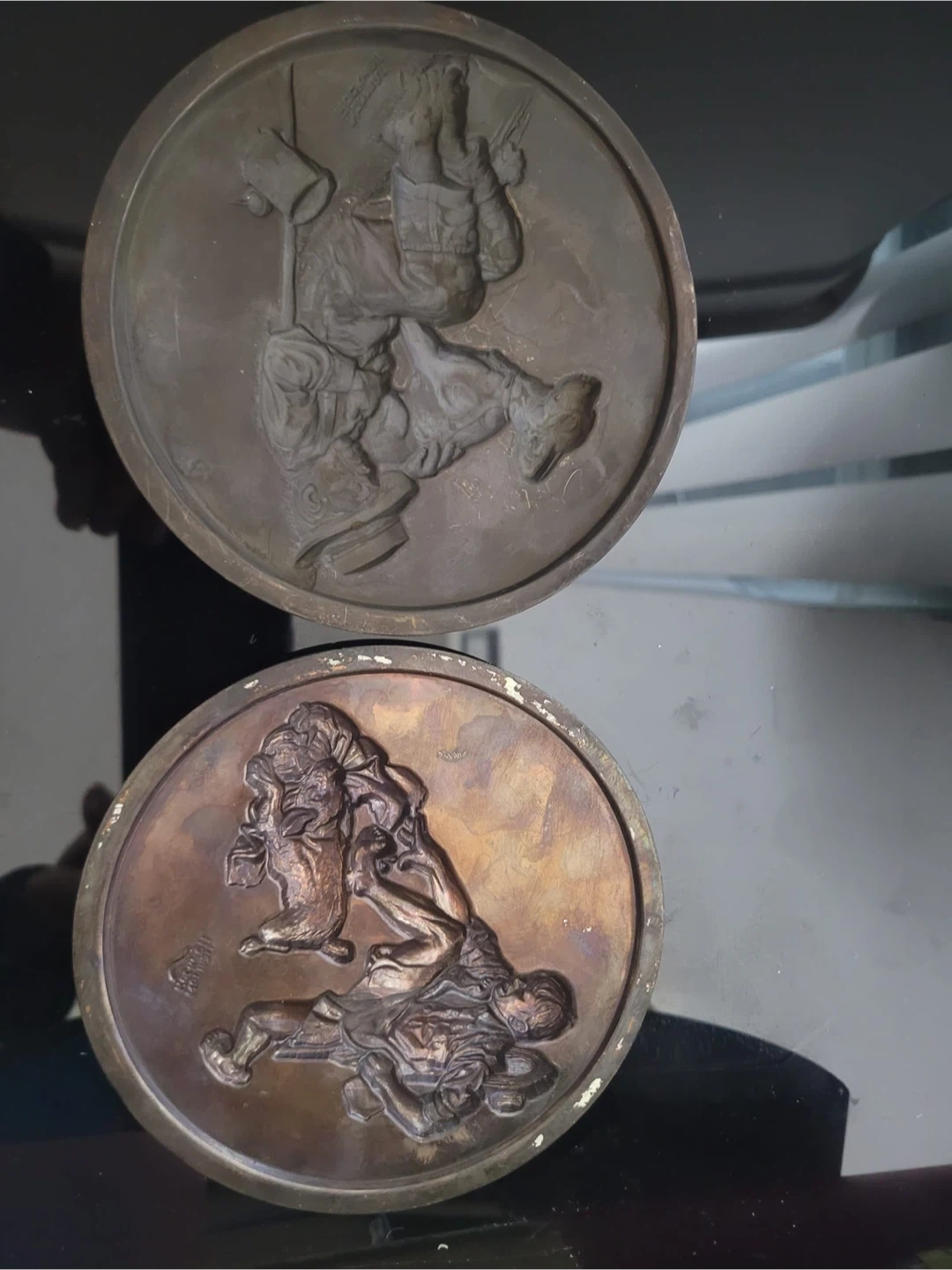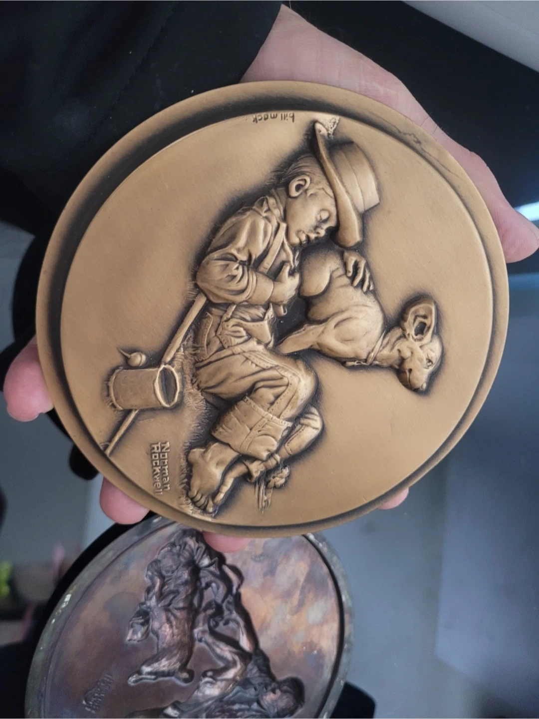 A collectible bronze medallion featuring Norman Rockwell's "The Runaway" artwork. It has a boy with a dog motif. This decorative piece is a part of a collection. It's made of metal.