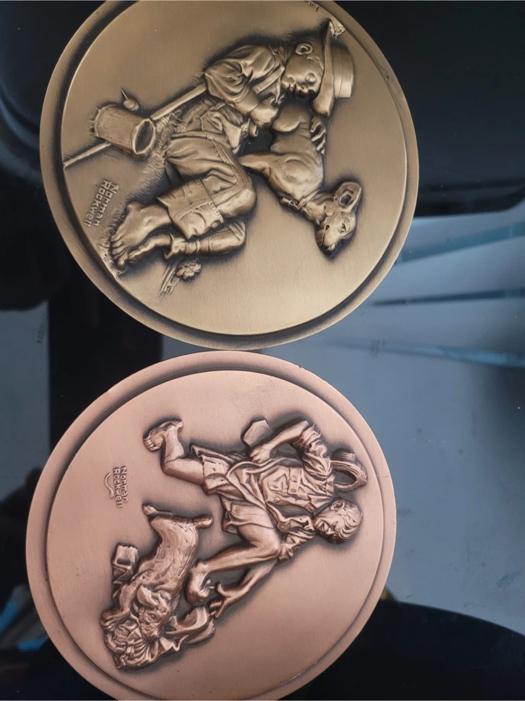 A collectible bronze medallion featuring Norman Rockwell's "The Runaway" artwork. It has a boy with a dog motif. This decorative piece is a part of a collection. It's made of metal.